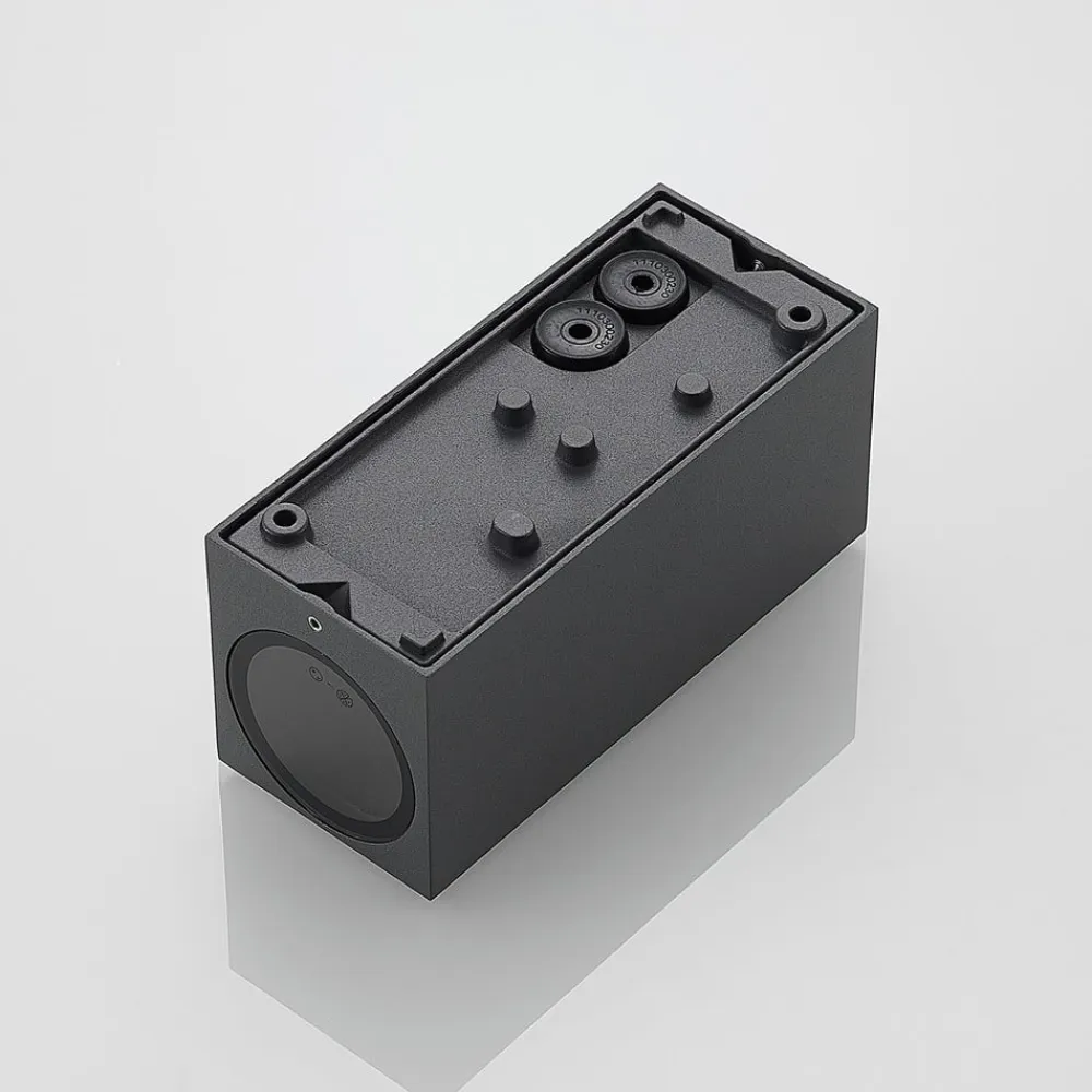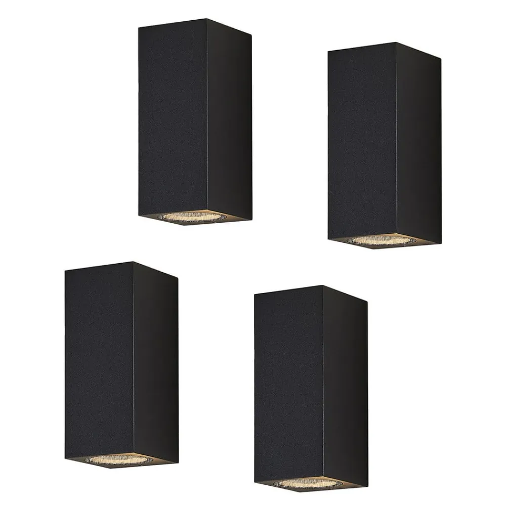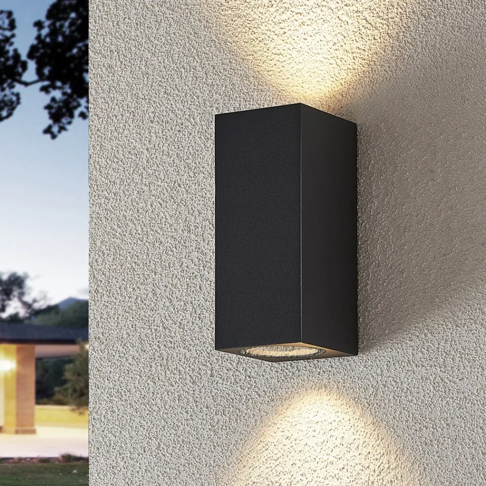 Mørkegrå Lavina udendørs væglampe af aluminium, 4-pak Lavina udendørs væglampe af mørkegråt aluminium og hærdet glas kombinerer trend og funktion. Armaturet er velegnet til udendørs områder og har et enkelt, men moderne industrielt design, der er særligt velegnet til moderne hjem. Den udendørs væglampe Lavina med 2 lyskilder har en rektangulær og aflang form og er lavet af mørkegråt trykstøbt aluminium. Lyset spotlights nedad og opad og er desuden beskyttet af hærdet glas. Det gør Lavina udendørs væglampe vejrbestandig. Udendørslampen kan også dæmpes med en passende glødepære. Lavina kan købes her som et sæt med 4 – Slagfasthedsklasse IK06