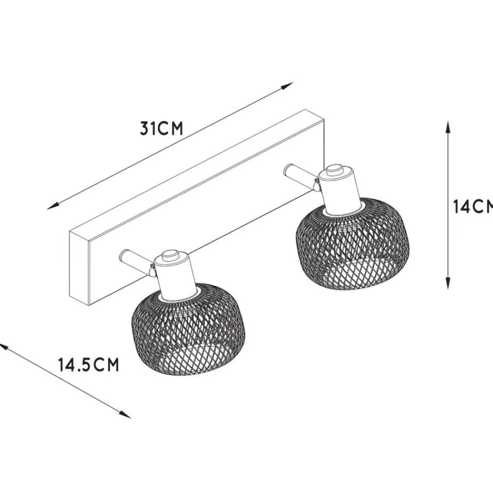 To-lys Maren loftspot med bevægelige spotsTo skærme er fastgjort til en aflang baldakin, som kan justeres takket være små led. De er udstyret med gitterskærme, som giver lys hele vejen rundt. Når lyset skinner gennem de små huller, skabes der et tiltalende mønster i rummet. Da skærmene kun er halvcirkelformede, er de åbne forneden og tillader direkte lysudsendelse – også muligt som vægmonterede enheder