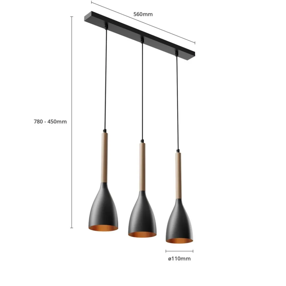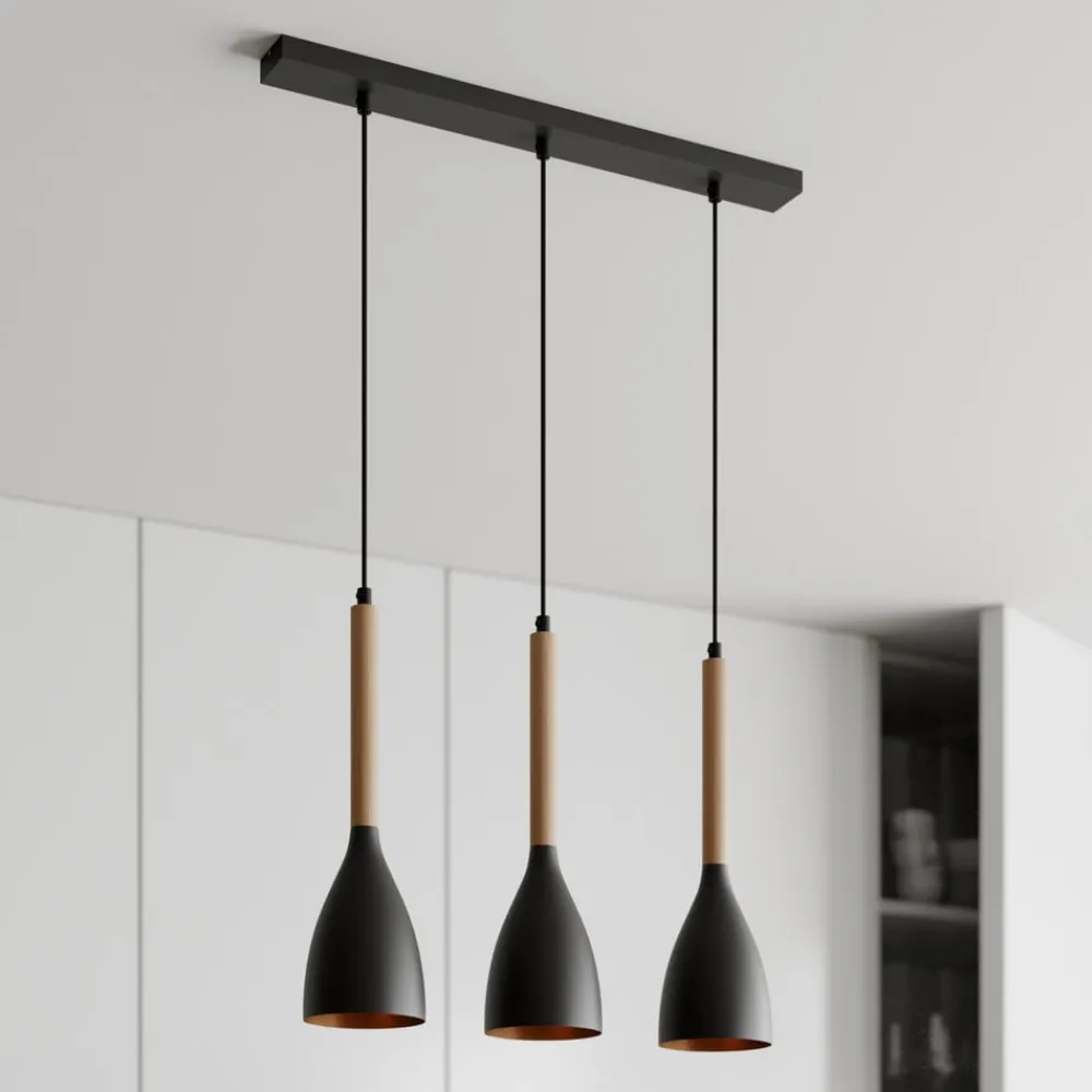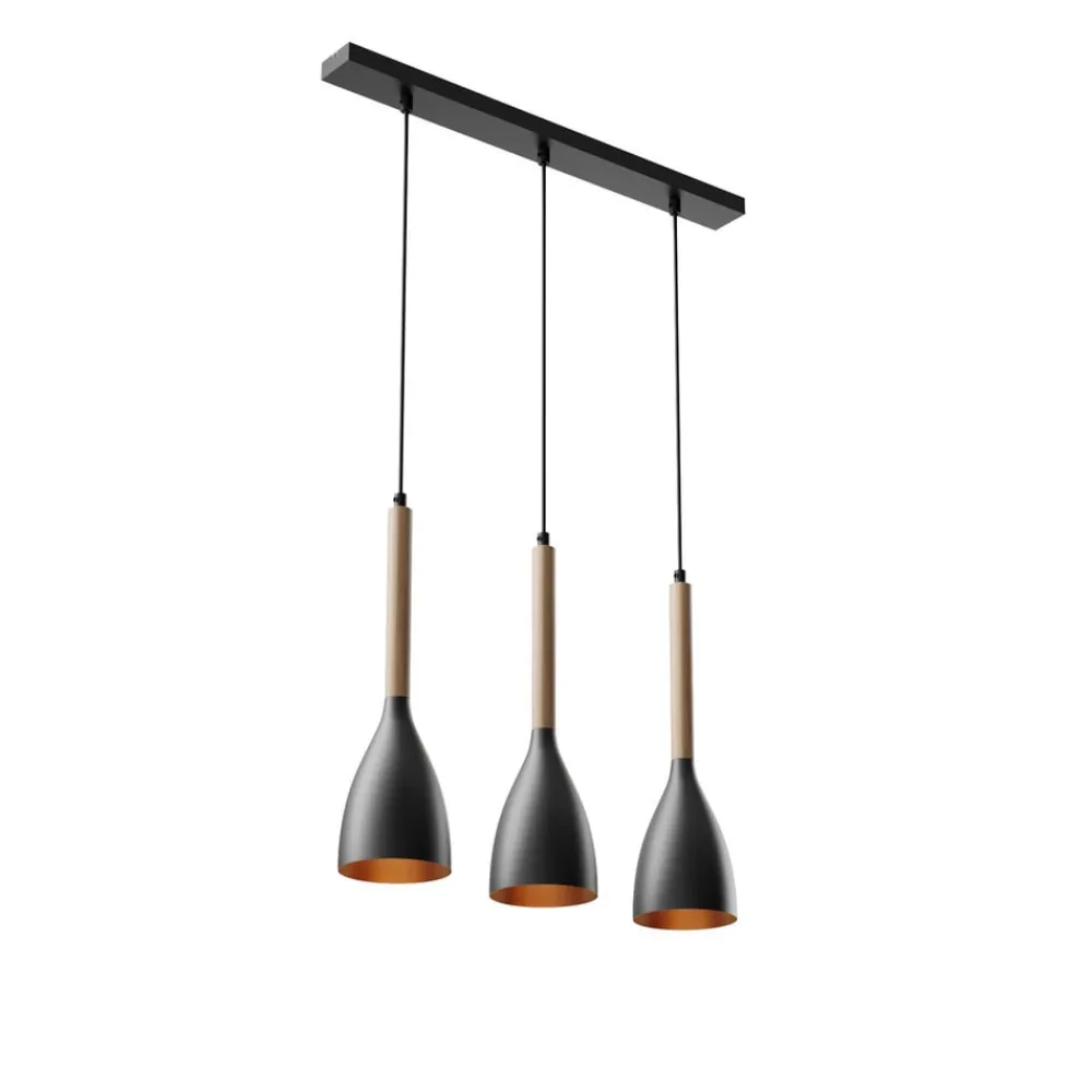 Hængelampen Muza med 3 lyskilder i sort og lyst træ kombinerer moderne design med naturlige materialer. Kombinationen af metal og træ giver ethvert rum en elegant og samtidig varm atmosfære. Lampen er ideel til stuen, spisestuen og køkkenet og sætter stilfulde accenter, der værdiger rummet.