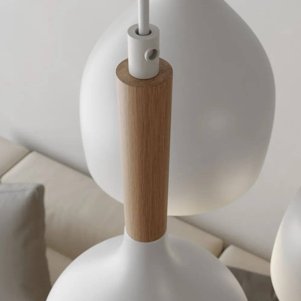 Særligt værd at fremhæve er muligheden for dæmpning, som kan realiseres via en ekstern dæmper. Dette giver mulighed for fleksibel tilpasning af lysintensiteten for at skabe den ønskede atmosfære. Den harmoniske farve i hvid og lyst træ understreger det moderne udseende og gør hængelampen Noak til et alsidigt belysningselement, der både er funktionelt og æstetisk overbevisende.