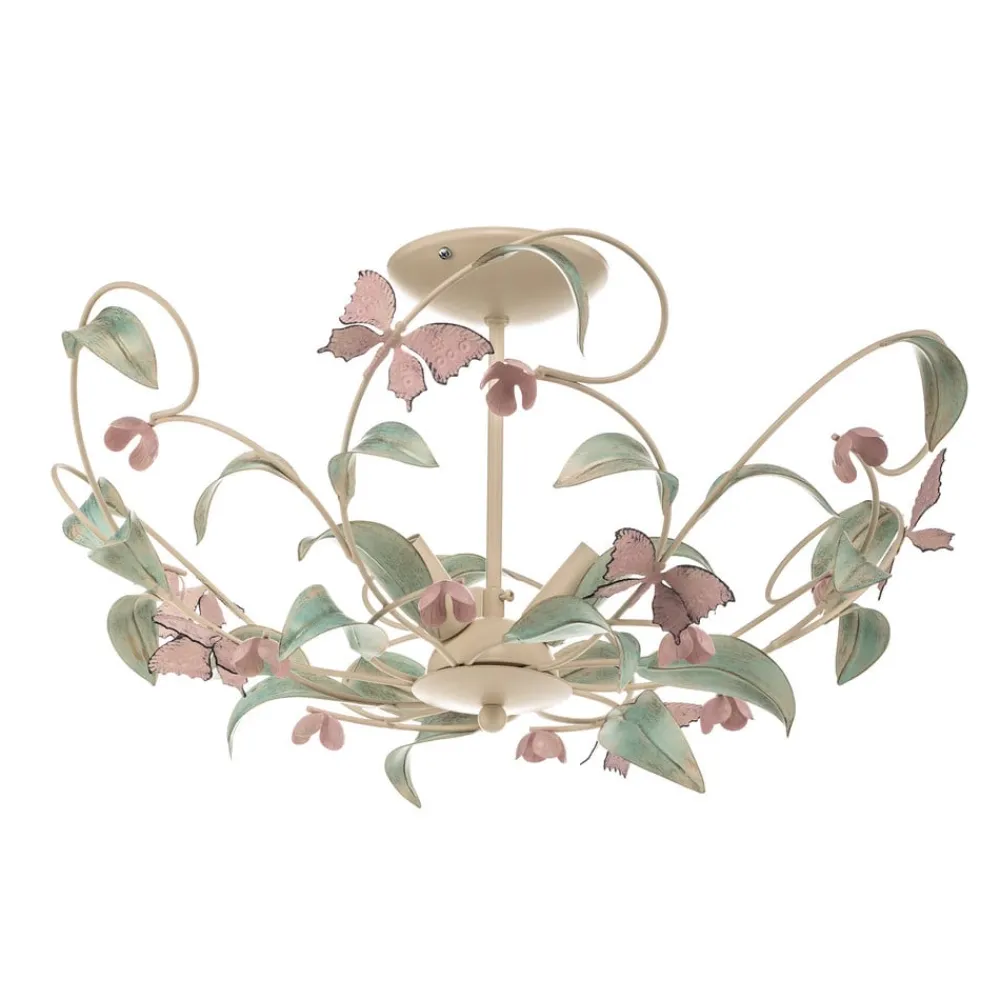 Loftlampen BUTTERFLY forener florentinsk stil med en harmonisk farvekombination af creme, grøn og rosé. Denne lampe med 3 lyskilder er fremstillet af rustfrit stål og plast i høj kvalitet og giver en imponerende lyseffekt, der skaber en stilfuld atmosfære i ethvert rum. Uanset om den hænger i stuen, soveværelset, entreen eller spisestuen, er BUTTERFLY en alsidig lampe, der giver ethvert rum et særligt præg.
