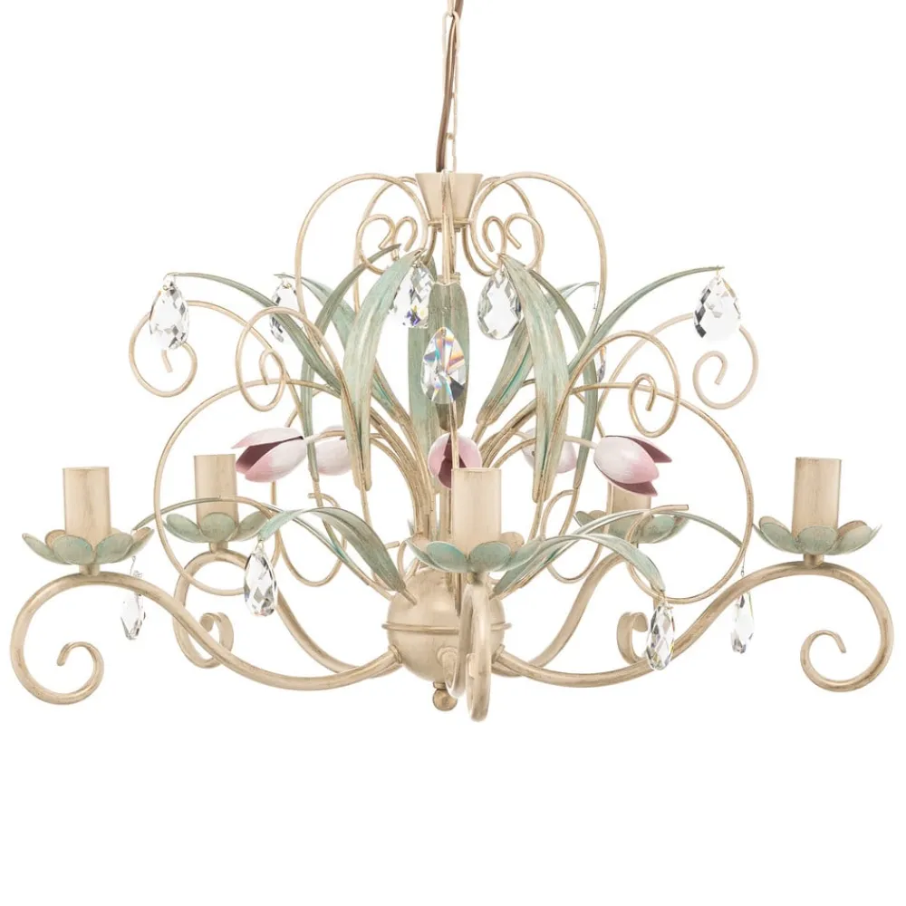 Lysekrone Luce med 5 lyskilder er indbegrebet af den florentinske stil og giver ethvert rum en uforlignelig elegance. Denne lysekrone er fremstillet af højkvalitetsmetal og fås i farverne hvid, grøn, lyserød og klar, og passer harmonisk ind i stuen, køkkenet, entreen og spisestuen. Det kunstfærdige design og den omhyggelige forarbejdning gør den til et blikfang, der beriger både klassiske og moderne indretningsstilarter.