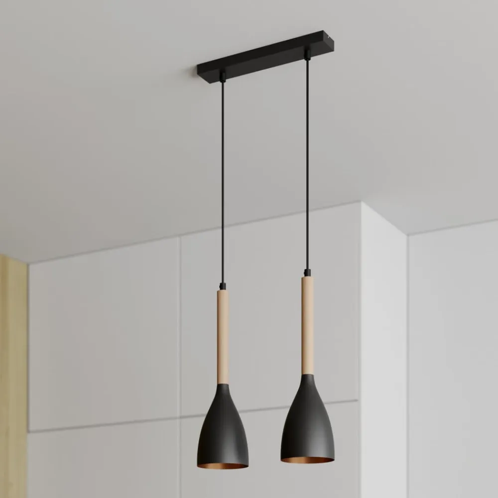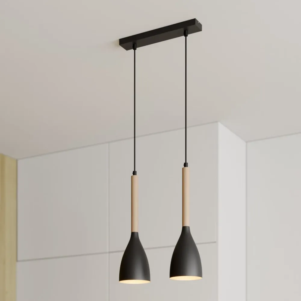 Hængelampen Muza kombinerer moderne design med naturlige materialer og skaber dermed en harmonisk atmosfære i ethvert rum. Kombinationen af sort metal og lyst træ giver lampen en tidløs elegance, der passer perfekt ind i forskellige indretningsstilarter. Med sin konstruktion med 2 lyskilder sikrer den optimal belysning i stuen, køkkenet eller spisestuen og sætter stilfulde accenter.