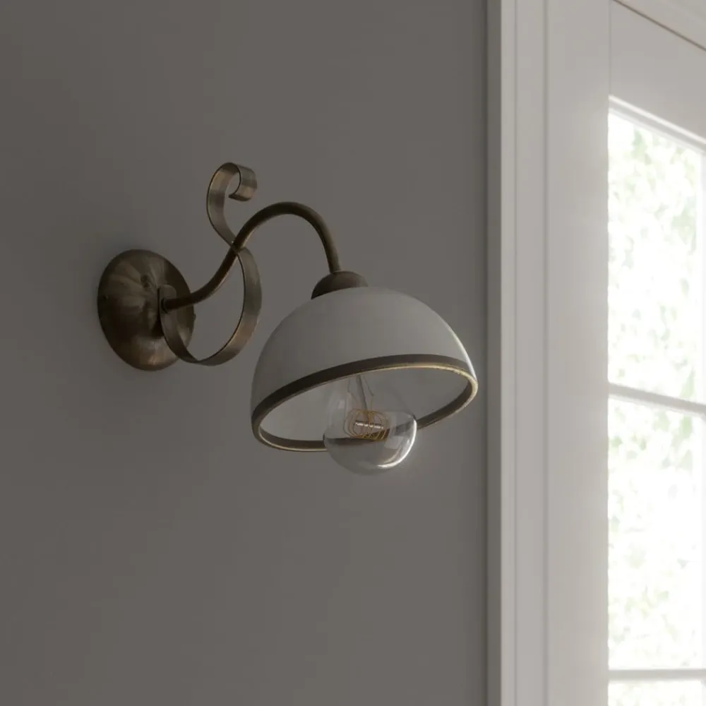 Væglampe Antica i landlig stil forener rustik elegance med funktionel alsidighed. Den er fremstillet af højkvalitetsglas og metal og stråler i en tiltalende antik messing- og opal hvid finish. Denne lampe er ideel til stuer, entreer og spisestuer og giver ethvert rum en varm og indbydende atmosfære.