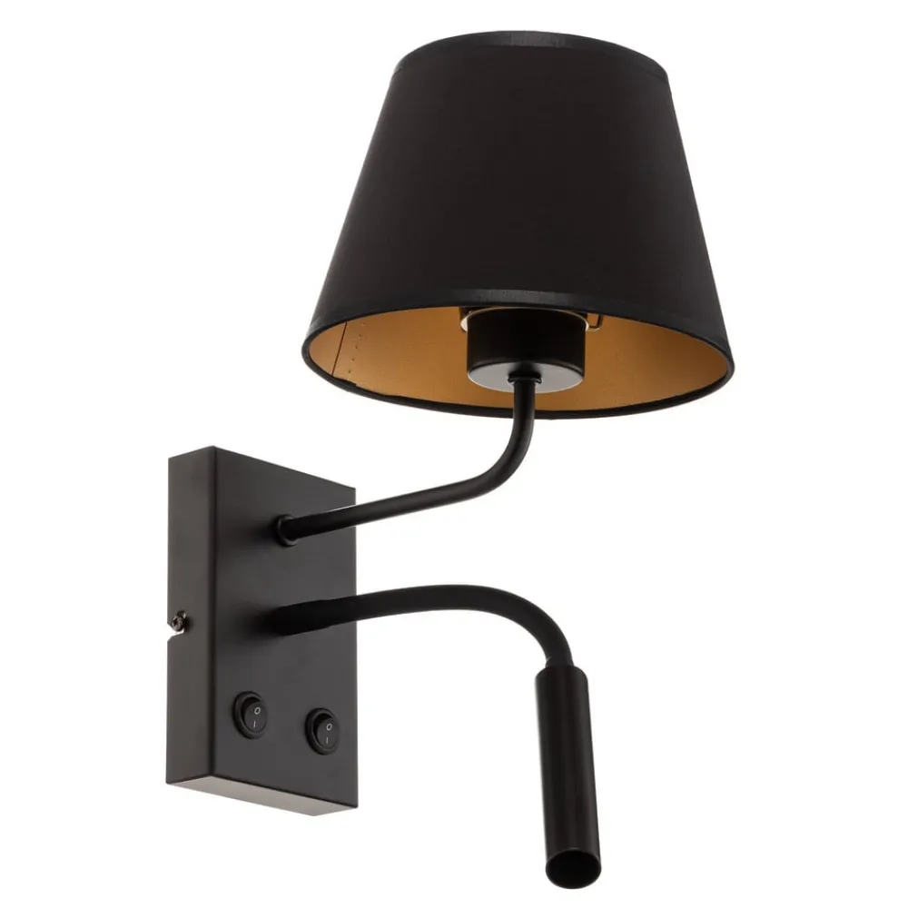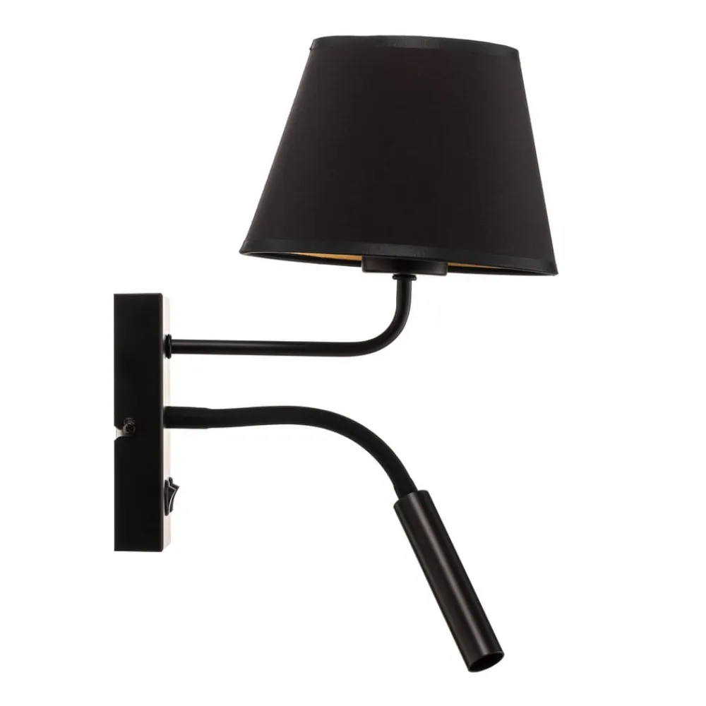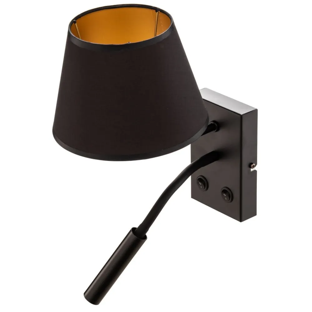 Væglampe Soho forener moderne design med praktisk funktionalitet og bliver dermed et stilfuldt highlight i ethvert rum. Den er fremstillet af højkvalitetsmetal og eksklusivt stof og imponerer med sin koniske form og den elegante farvekombination af sort og guld. Denne lampe er ikke kun et blikfang, men har også en integreret læselampe, der giver målrettet belysning og dermed er ideel til stuen og soveværelset.
