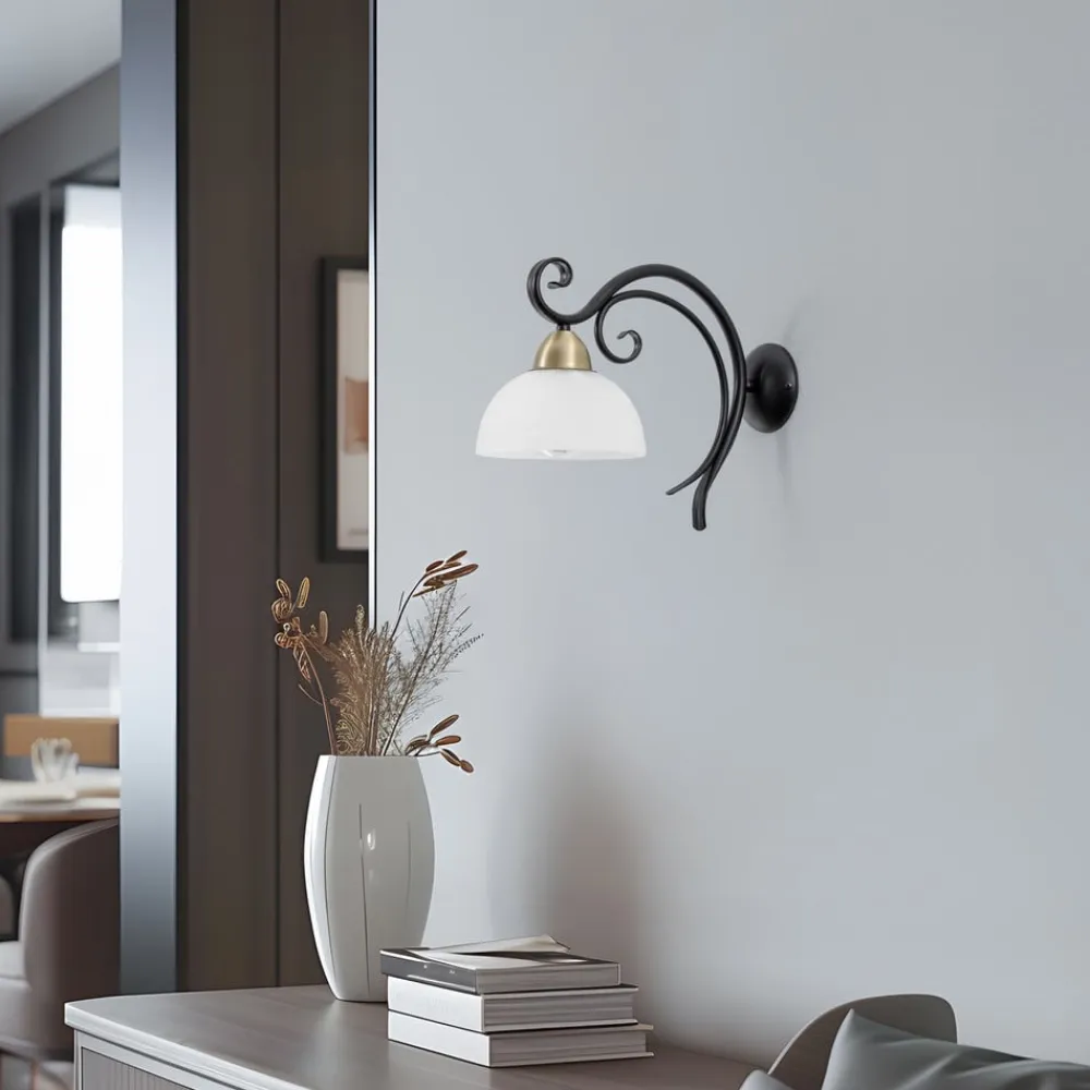 Væglampe Flora kombinerer rustik charme med moderne elegance og er et highlight i enhver bolig. Den er fremstillet af højkvalitetsglas og robust stål og imponerer med sine satinerede, sorte og messingfarvede accenter. Denne kombination giver lampen en tidløs æstetik, der passer perfekt ind i forskellige indretningsstilarter. Flora er fremstillet i Europa og står for kvalitet og håndværksmæssig præcision.