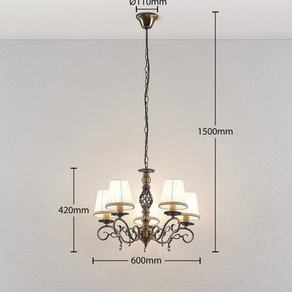 Finnick lysekrone med 5 lyskilder og romantisk charme Finnick lysekronen har en ramme i antik messinglook, der giver lysekronen en elegant og romantisk karakter med sine udsmykkede og kunstneriske linjer. Fem arme strækker sig fra stellet ud til siderne, og deres buede form minder om planteranker. En hvid lampeskærm i tekstil er fastgjort til hver af armene og giver en blød og behagelig lysfordeling. Finnick gør en særlig god figur over et spisebord og skaber en hyggelig, men stilfuld stemning i rummet.
