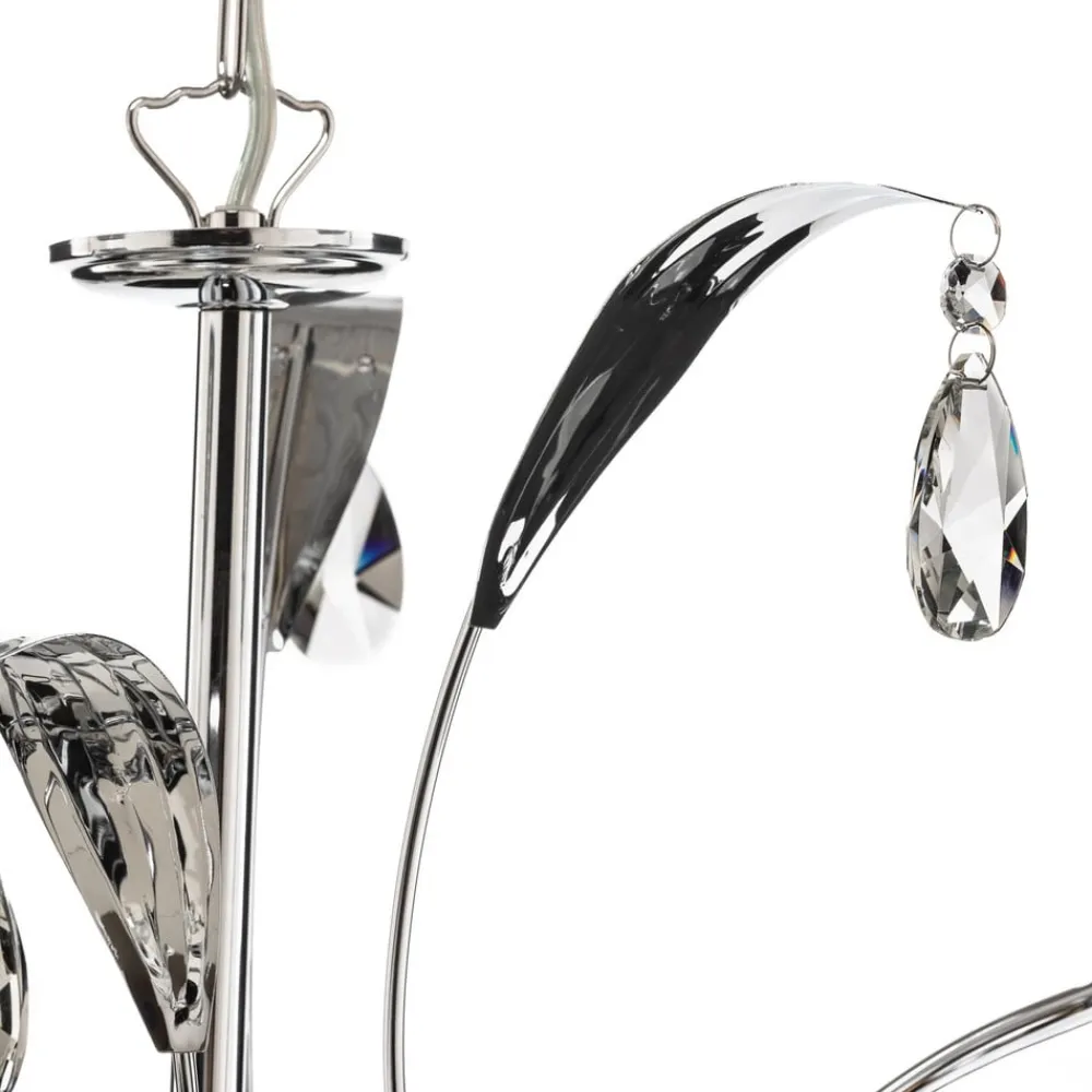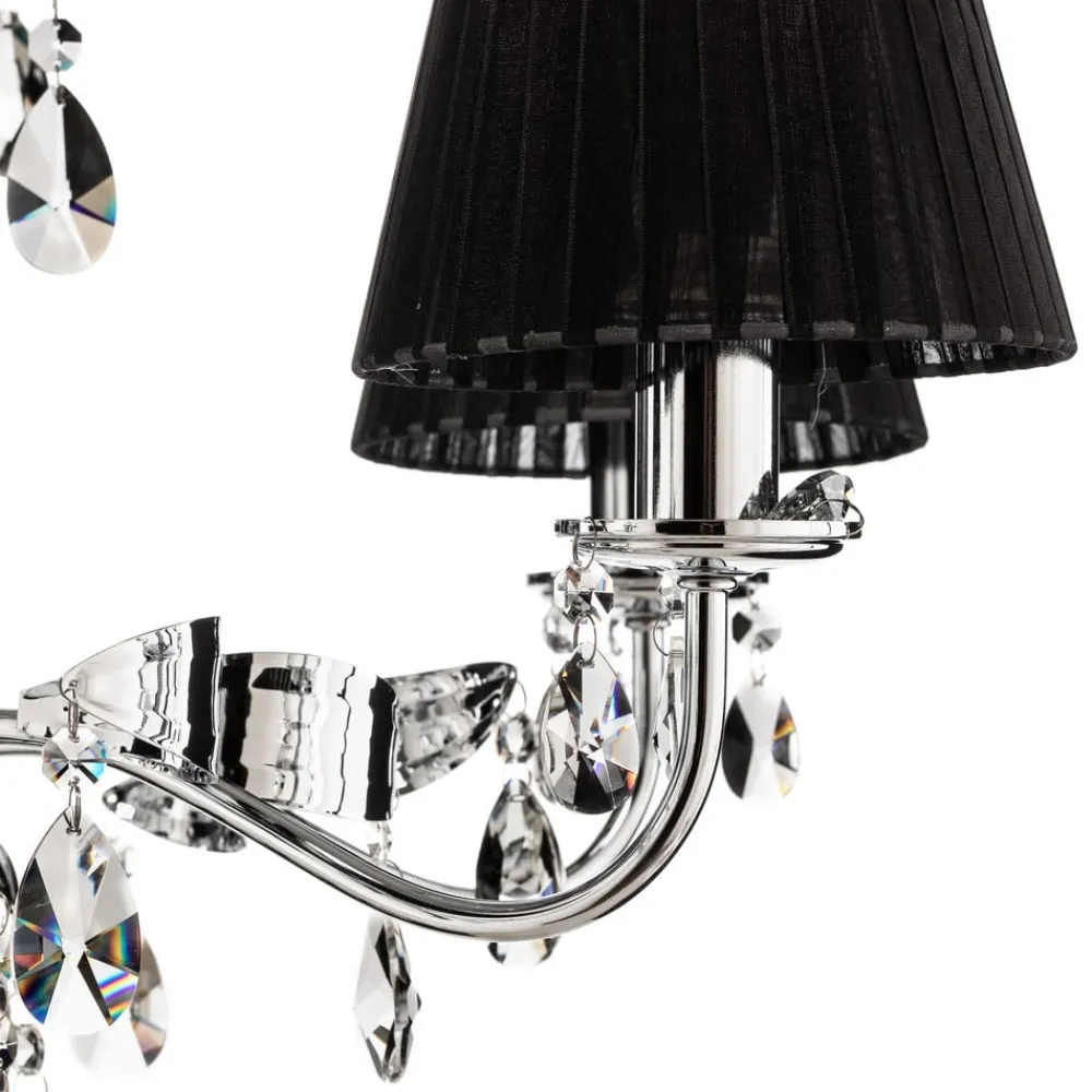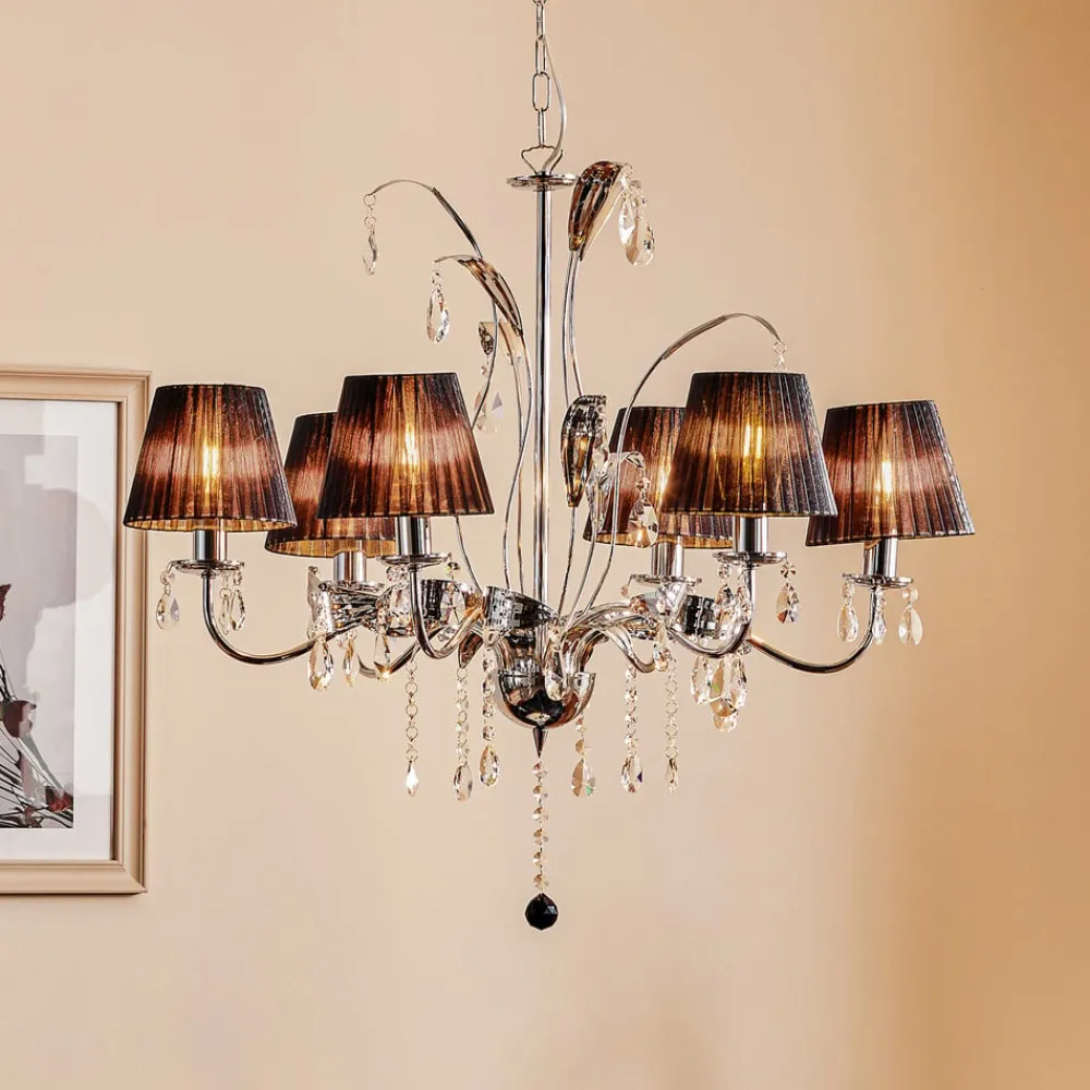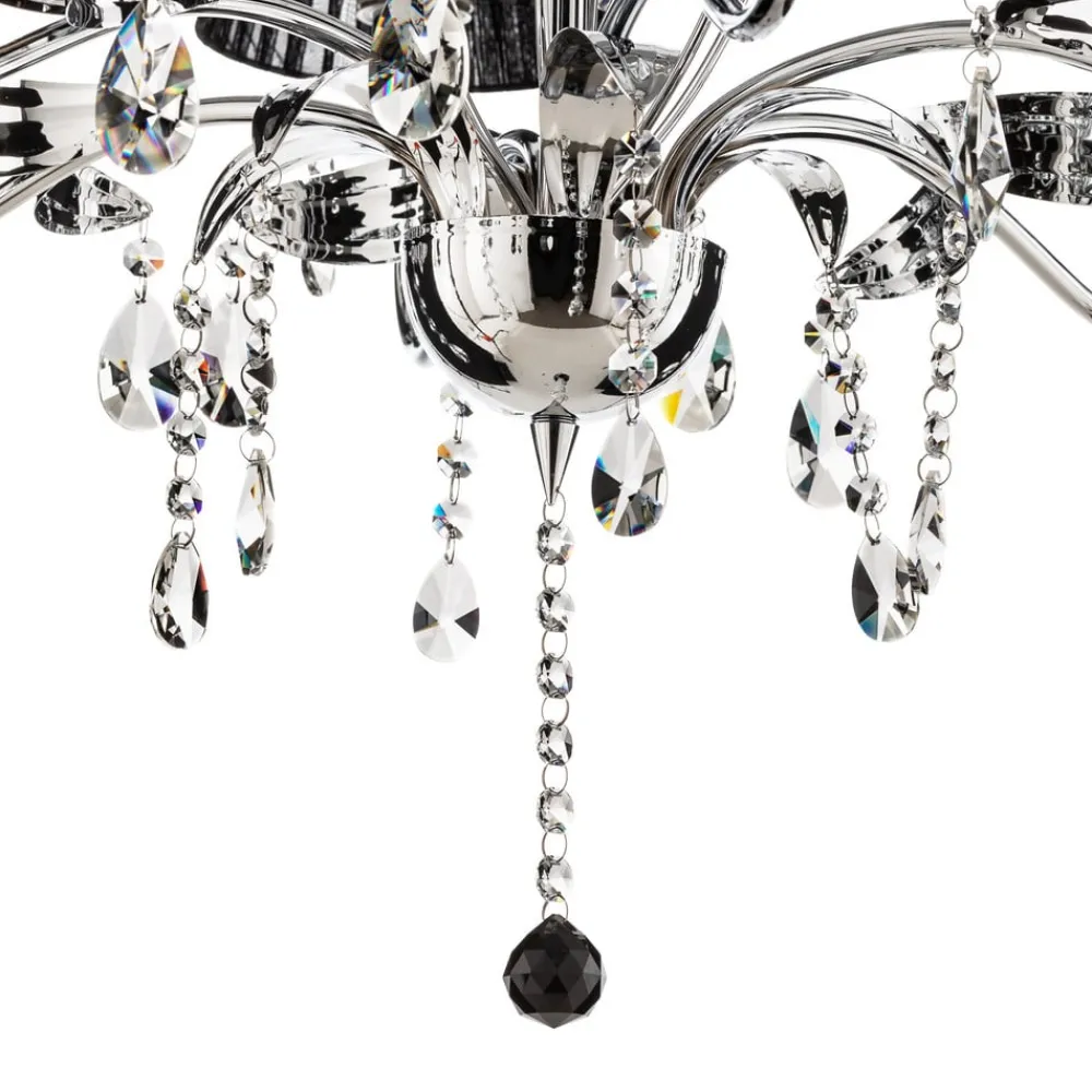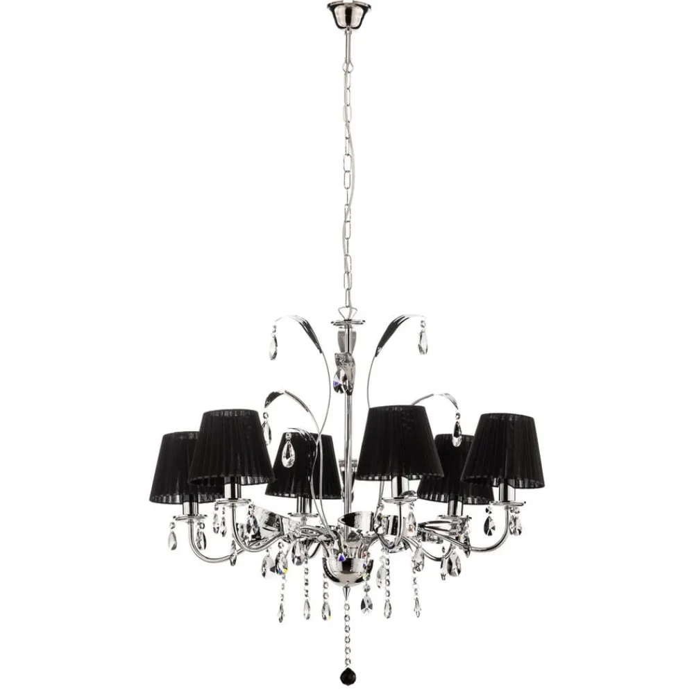 Lysekrone Jacqueline, 6 lyskilder, sort, forener tidløs elegance med moderne alsidighed. Fremstillet af højkvalitets jern, stof og K9 krystalglas, tilbyder den en imponerende kombination af robusthed og raffinement. Farvekombinationen af krom, sort og klar giver lysekronen et elegant look, der sætter accenter i både stuen og spisestuen. De seks lyskilder sørger for en jævn belysning og skaber en indbydende atmosfære.