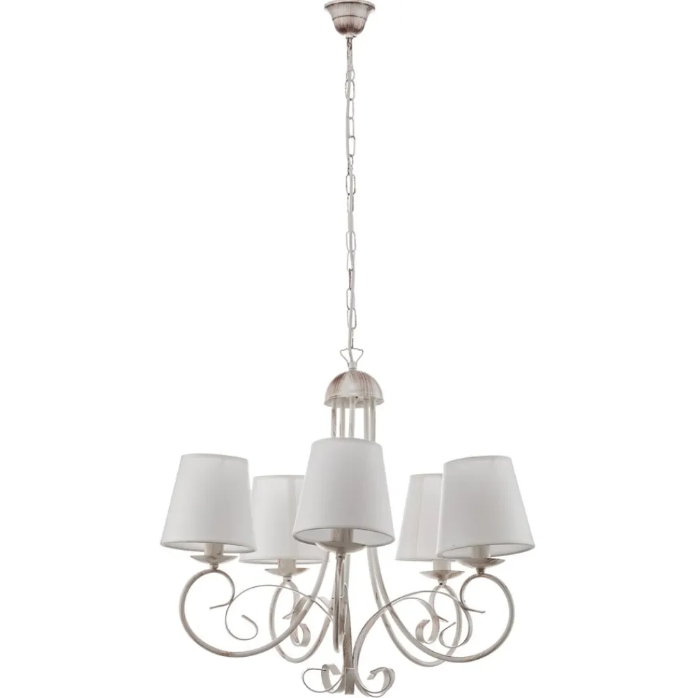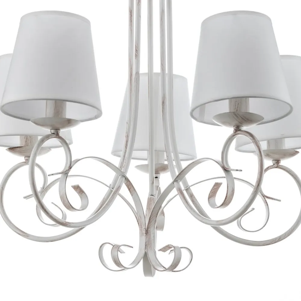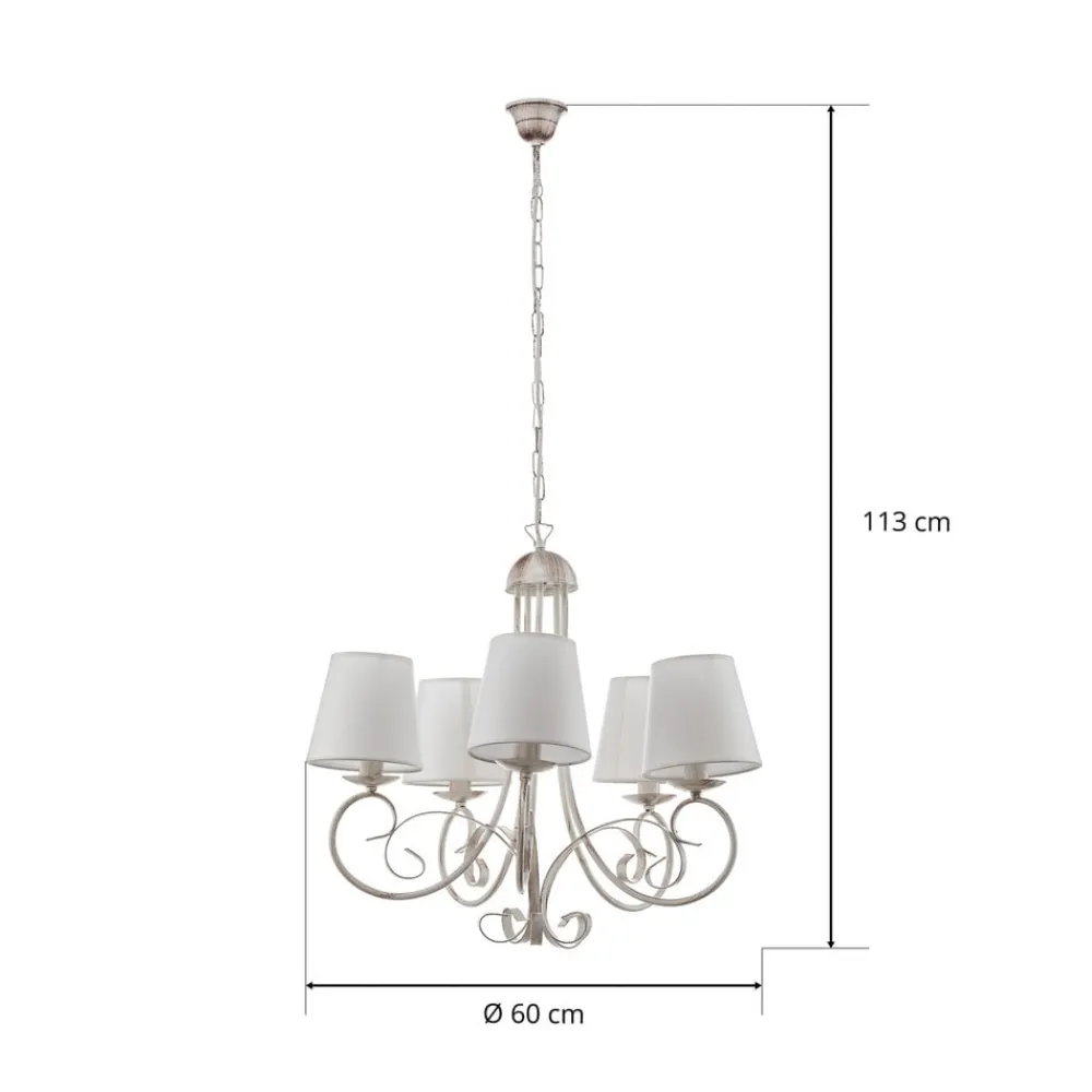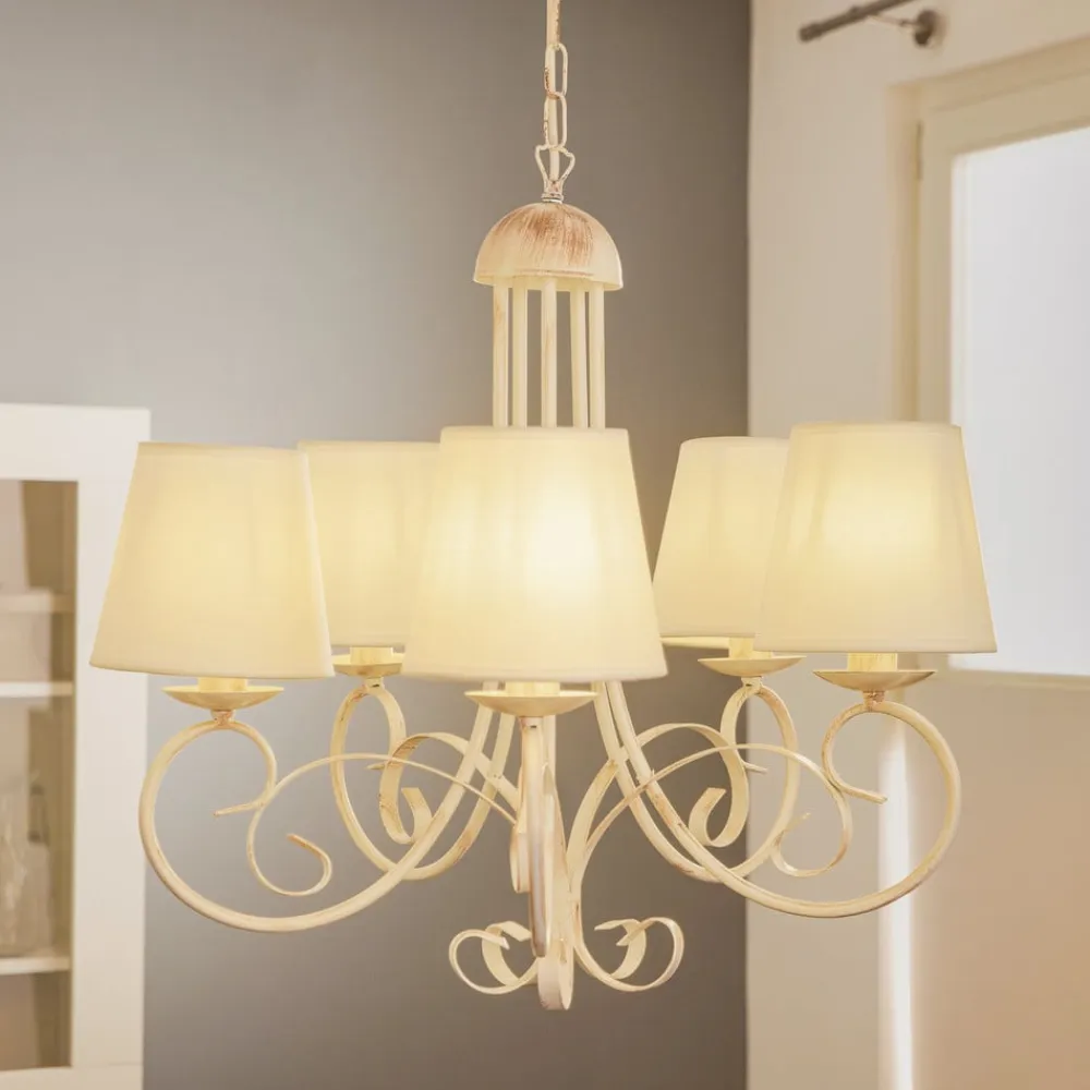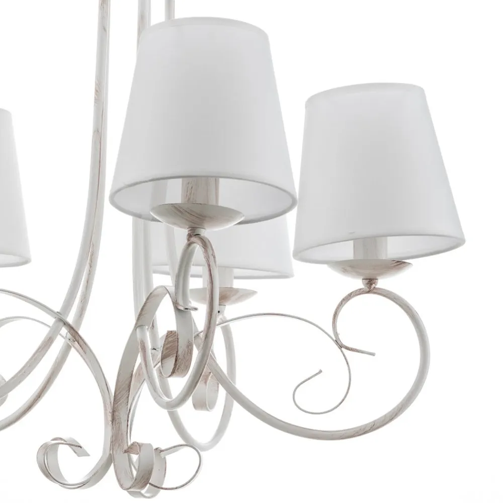 Lysekrone Pompei forener rustik charme med tidløs elegance og bliver et blikfang i enhver stue eller spisestue. Den er fremstillet af højkvalitets jern og forædlet med tekstilskærme og stråler i en tiltalende antik hvid farve. Denne kombination af materialer og farver giver rummet en varm og indbydende atmosfære, der passer til både traditionelle og moderne indretningsstilarter.