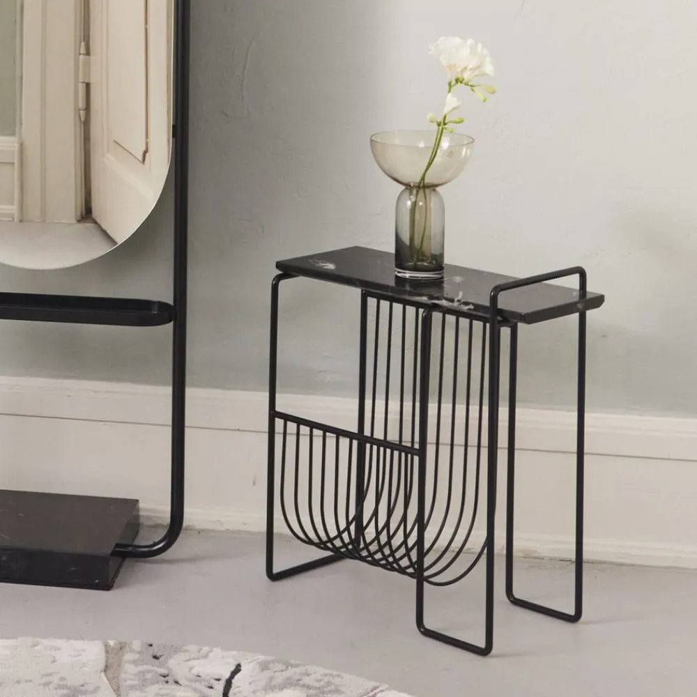 Sino magasinholder i marmor og stål Med Sino magasinholder får du også et lille, stilfuldt sidebord, som er perfekt til at stå ved siden af sofaen med en kop kaffe eller andet godt og tage en kort pause. Den integrerede magasinholder betyder, at du altid har dine yndlingsbøger og -magasiner lige ved hånden, mens stålrammen afrundes af en bordplade i marmor. Resultatet er den elegante allrounder Sino. produktinformation: Fremstillet af 100 % marmor og stål med gummifødder. Maksimal belastningskapacitet 5 kg. plejeinstruktioner: For at fjerne snavs og støv skal du tørre emnet af med en fugtig klud. Marmor tåler ikke syrer eller sure rengøringsmidler som f.eks. eddike. Sørg for at tørre sure og normale væsker, der spildes på overfladen, af med det samme for at undgå pletter.