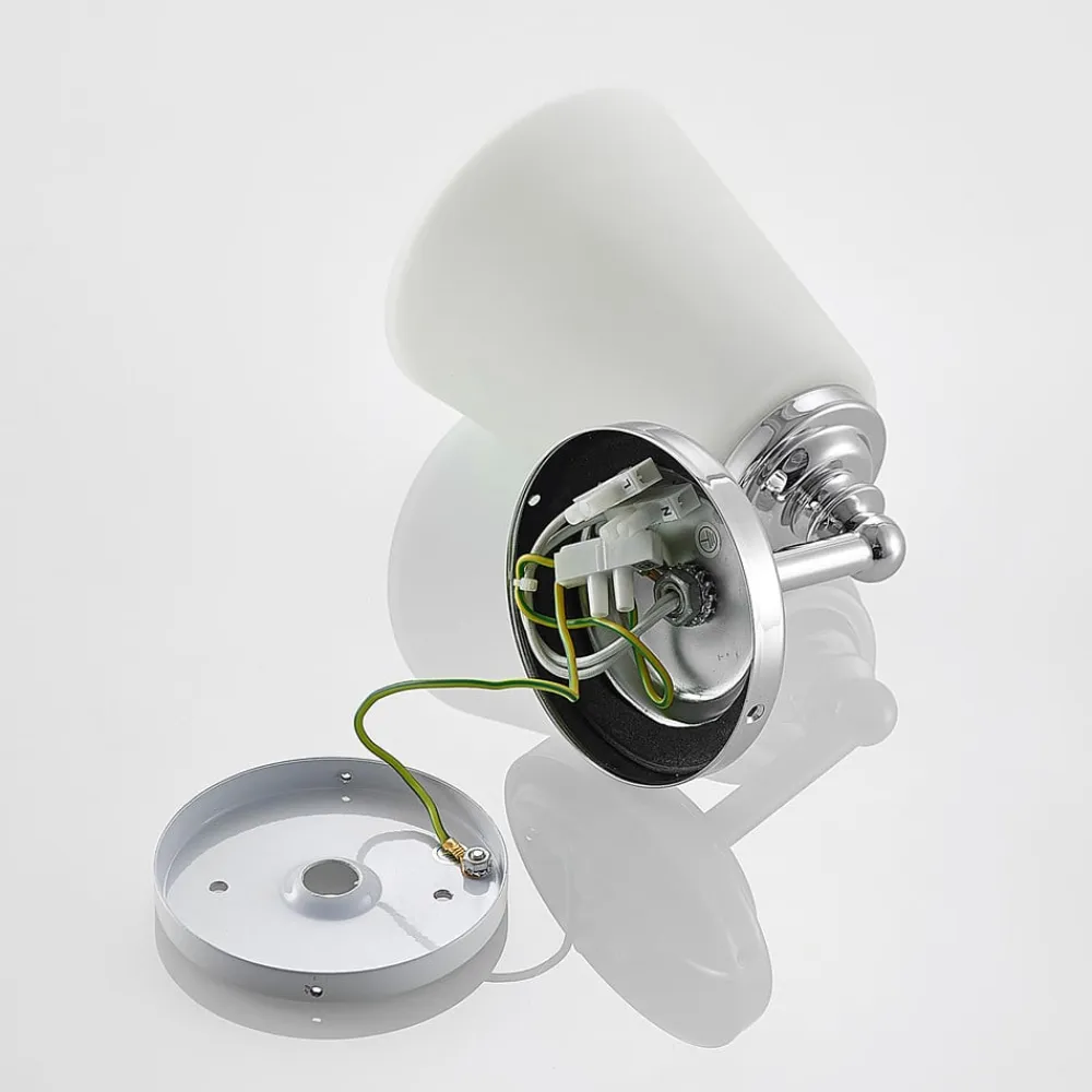 Elegant Mahdi væglampe til badeværelset med hvid glasskærm, IP44 Mahdi kan installeres over eller – ideelt set i par – ved siden af et spejl og er velegnet til brug i badeværelser og fugtige rum generelt takket være sin forhøjede kapslingsgrad. Takket være det hvide glas er lyset blødt og ensartet og giver en smuk belysning på badeværelset. Naturligvis gør væglampen også en god figur i andre områder af badeværelset. Det opale glas suppleres af en rund ramme med kromfinish, som igen harmonerer smukt med det meste badeværelsesinventar.