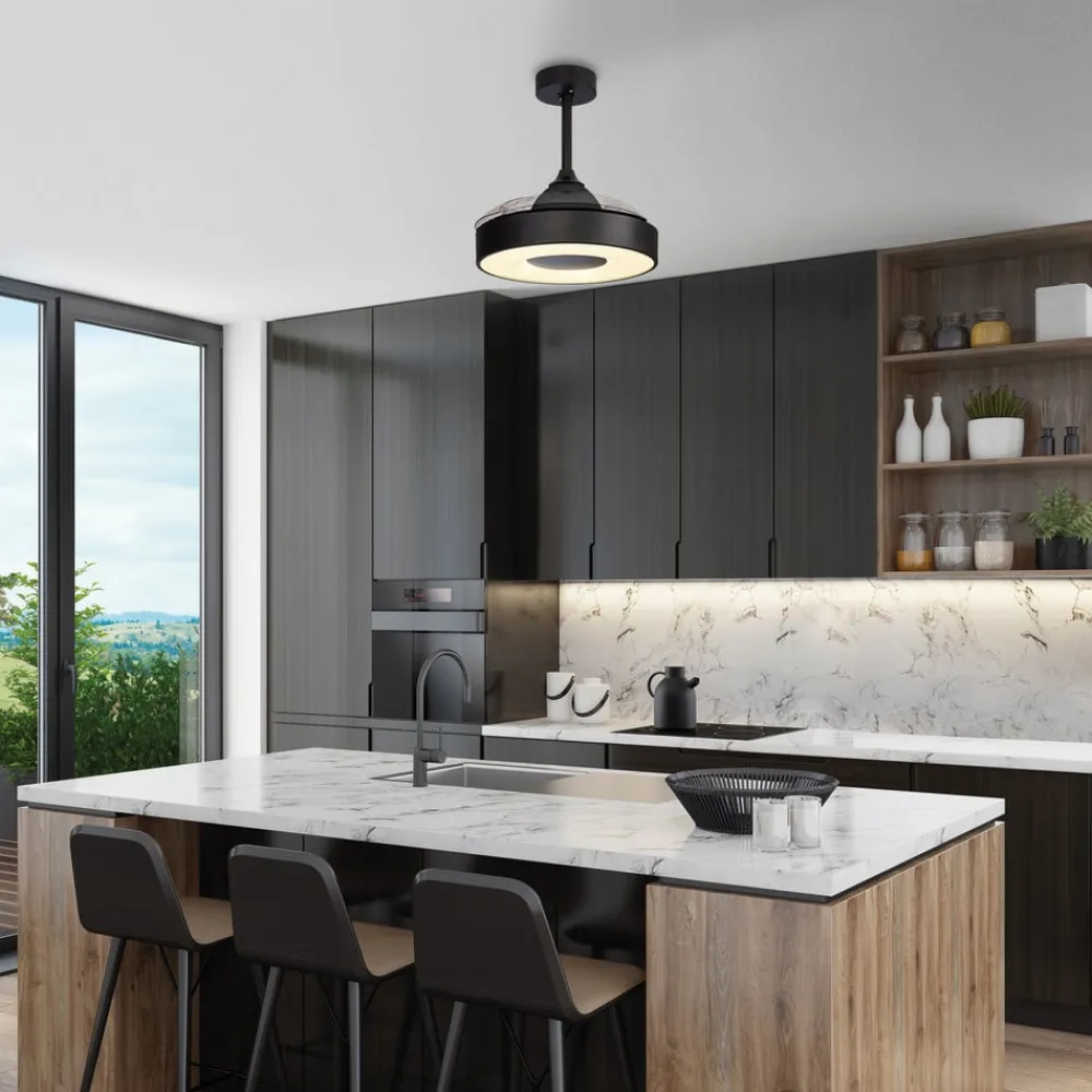 LED-loftventilatoren Coin Mini kombinerer en forfriskende brise med moderne almindelig belysning. De tre vinger af gennemsigtig plast er kun udfoldet, når ventilatoren er tændt, og skjules over den runde krop, når ventilatoren er slukket. Korpuset indeholder en kraftig LED-lampe, hvis lys kan dæmpes og reguleres i farvetemperatur og stråler ud over et stort område nedad gennem en satineret afskærmning. Betjeningen foregår med den medfølgende fjernbetjening.