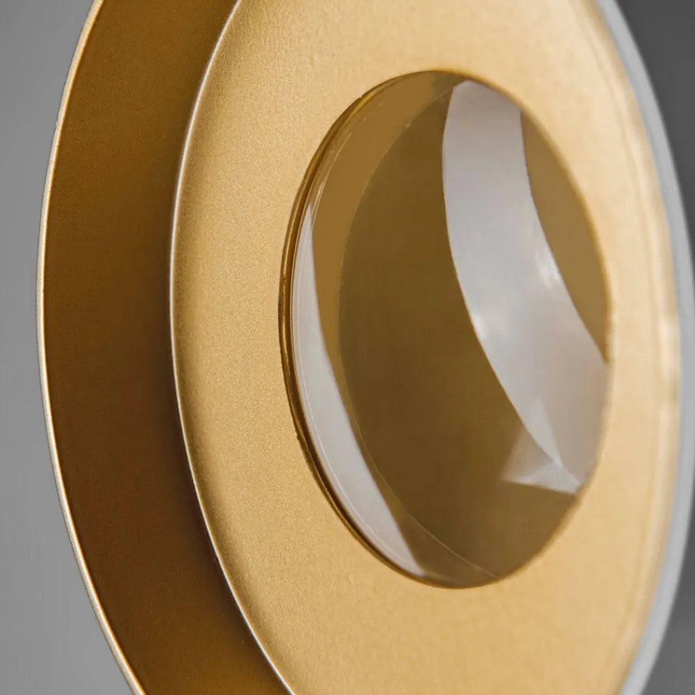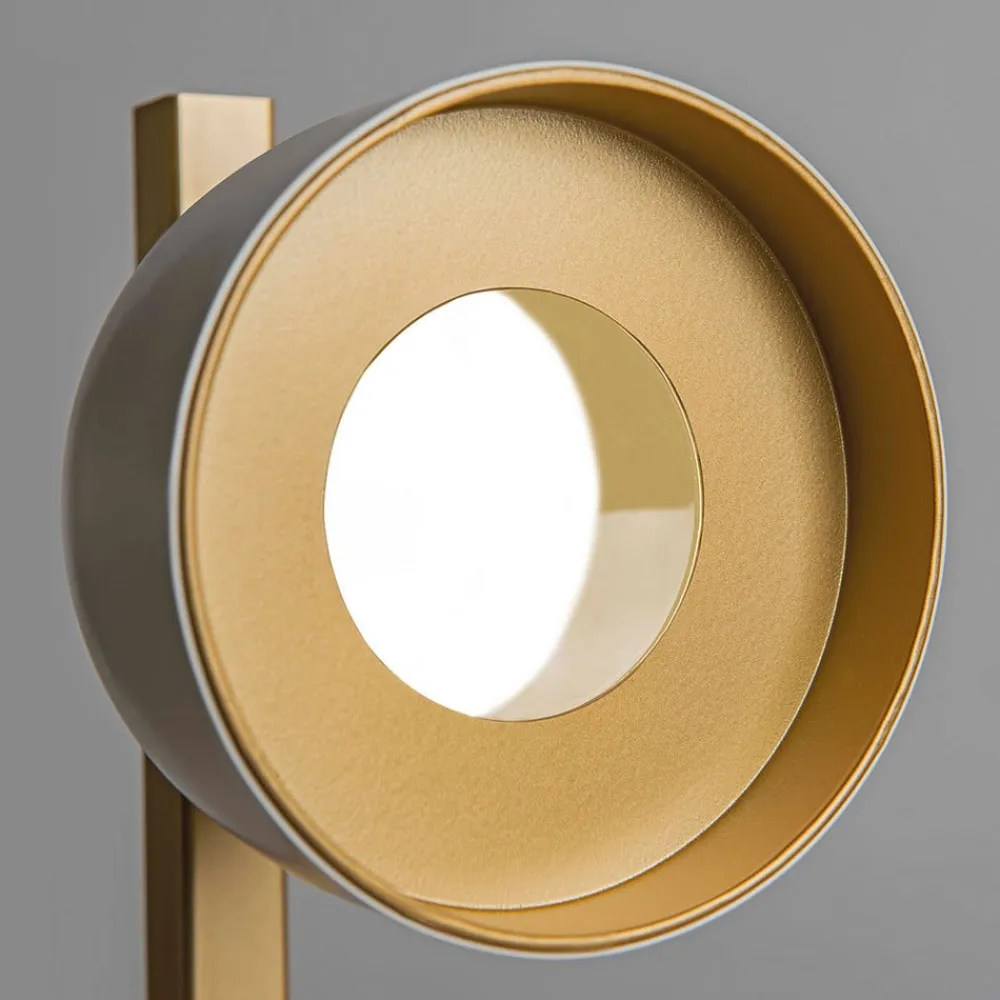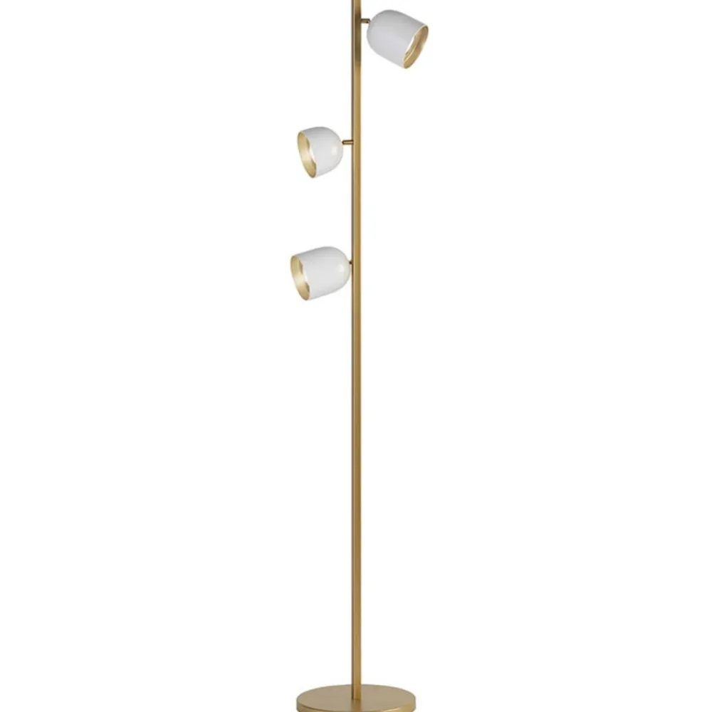 Imponerende Dome LED-gulvlampe med tre skærme Takket være sin størrelse er Dome LED-gulvlampen en iøjnefaldende lyskilde i moderne og sofistikerede opholds- og loungeområder. De kuppelformede skærme i forskellige størrelser er forskudt i den øverste del af det firkantede stativ. Da skærmene kan drejes og svinges og også har optiske linser, kan lysudbyttet styres efter behov. Den dominerende gyldne finish sikrer et elegant look i høj kvalitet.