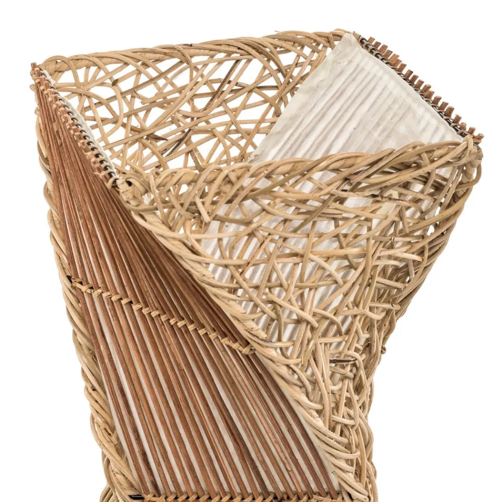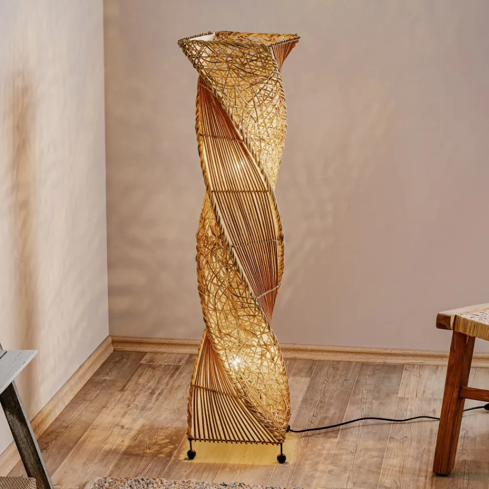 MARCO gulvlampe med snoede vævede naturmaterialer MARCO gulvlampen får sit individuelle præg af, at rattan og rispan lavet af bananblade er blevet vævet sammen og sat fast i en snoet form. Det giver et flot, lyst udtryk. Den særlige form understreges også. På grund af denne form er gulvlampen også meget dekorativ, når den er slukket. Lyskontakten er en del af forsyningskablet og er derfor meget brugervenlig.