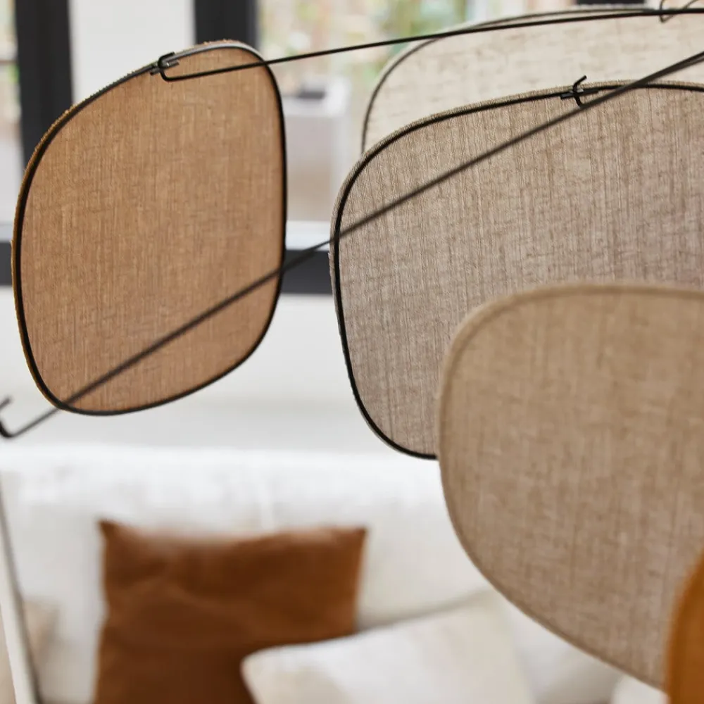 Denne ekstraordinære pendellampe fra det franske designmærke MARKET SET forener individualitet og harmoni i perfektion. Den centrale fatning er omgivet af flere linnedpaneler i rolige jordfarver, der er monteret i forskellige retninger og afstande. Stoffet er let gennemskinneligt og skaber et spil af lys og skygge, der ændrer sig med hver ny vinkel. Baldakin og metalstrukturen samt det tekstilbeklædte kabel er holdt i sort.