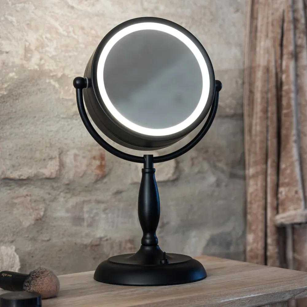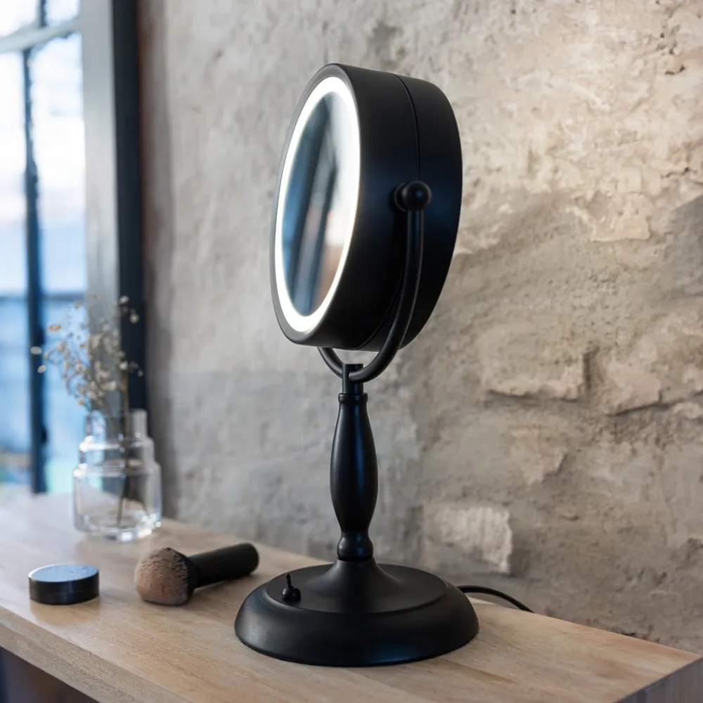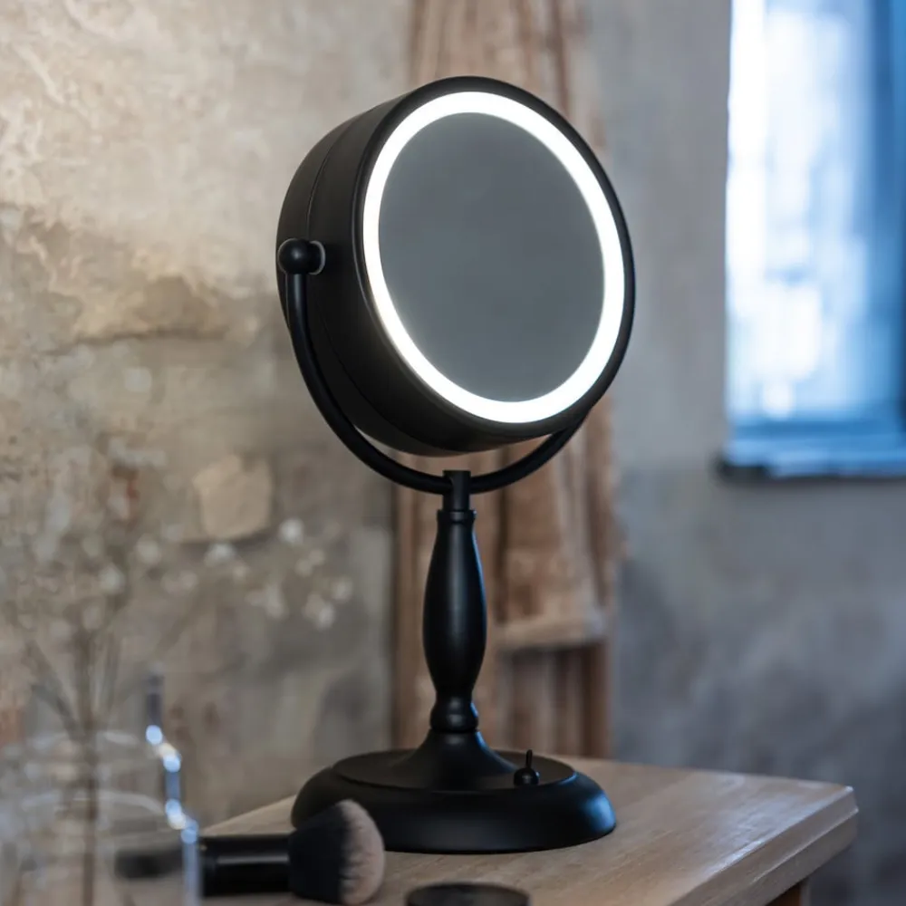 Ansigtsbordspejl med lys, sort, metal, højde 36 cm