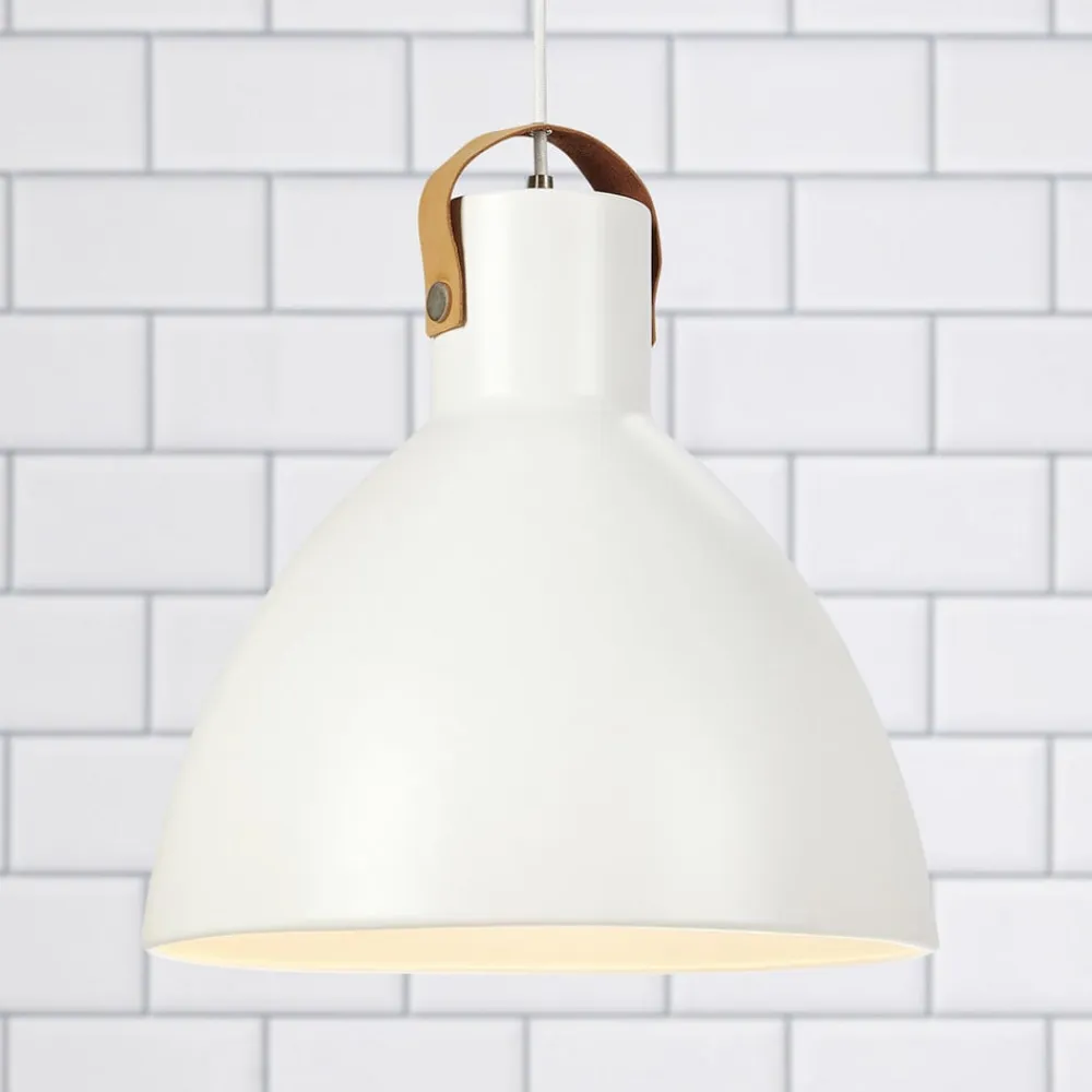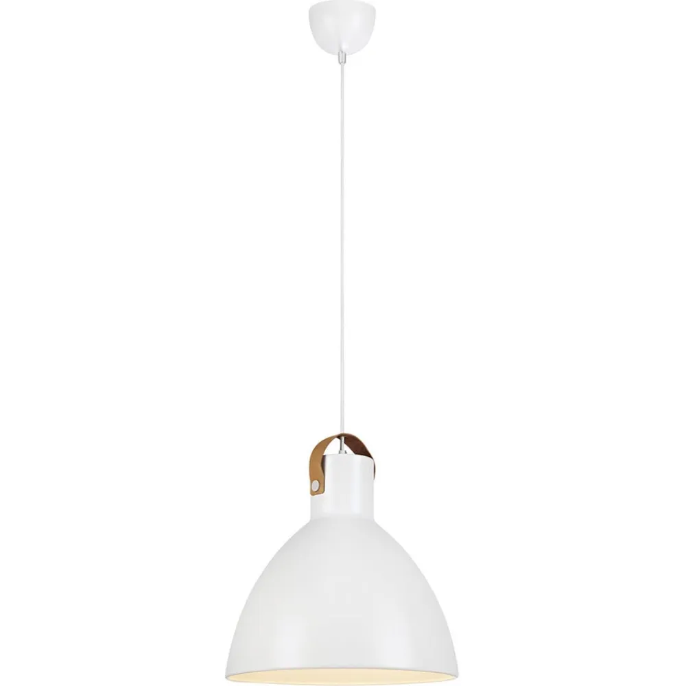 Den enkle metalliske kuppelformede skærm med cylindrisk øvre afslutning suppleres farvemæssigt af tekstilkabelet. En lædersløjfe på skærmen tilføjer et livgivende element.