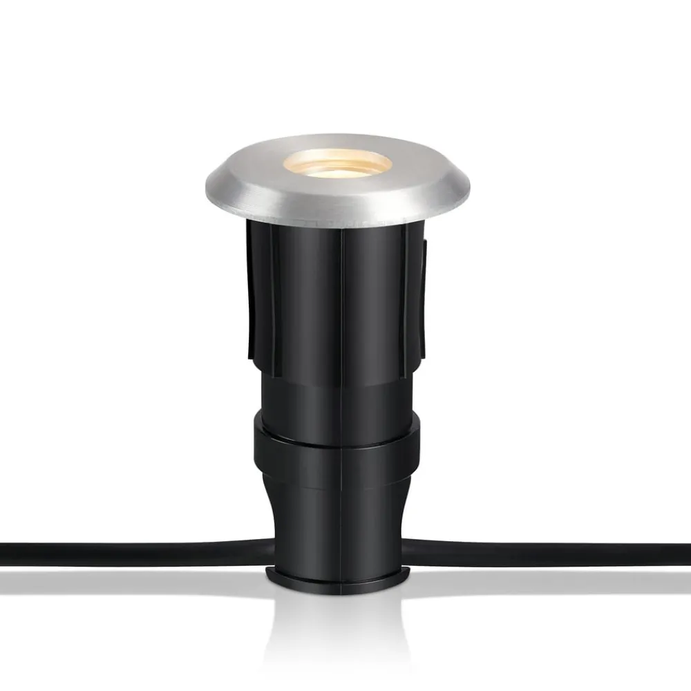 LED-spot til nedgravning Decklampe med opadrettet, præcis lysudsendelse Denne runde spot kan nemt installeres på f.eks. en terrasse og giver et præcist, accentueret lys på udendørsarealer. LED-loftslampen er en del af Garden 24V-systemet og kan forbindes med mange andre komponenter for at fremhæve og tilpasse udendørsområdet perfekt. Den nedgravede spotlight er lavet af aluminium og har et diskret design. Den kan nemt installeres ved hjælp af indgangs- og udgangskablet – yderligere komponenter som f.eks. en passende transformer er nødvendige for idriftsættelse (se tilbehør)