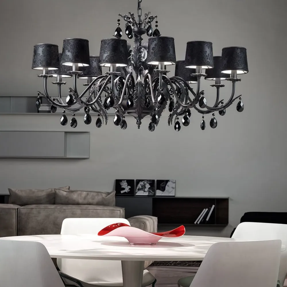 Med Asfour-krystaller og fornemme damaskskærme – sort lysekrone Angelis
