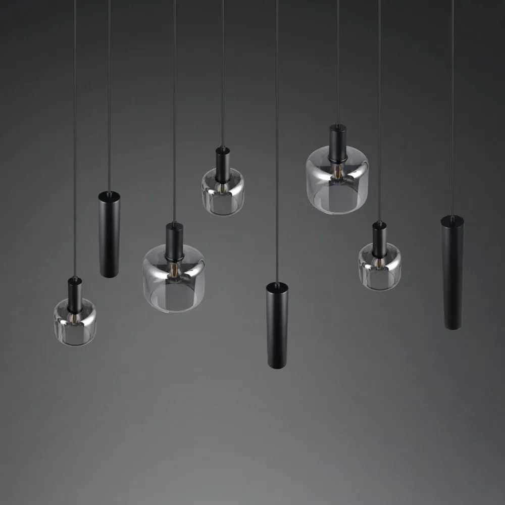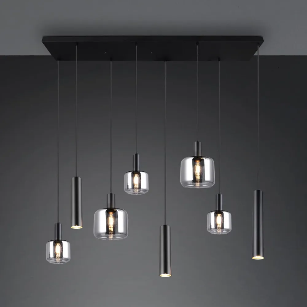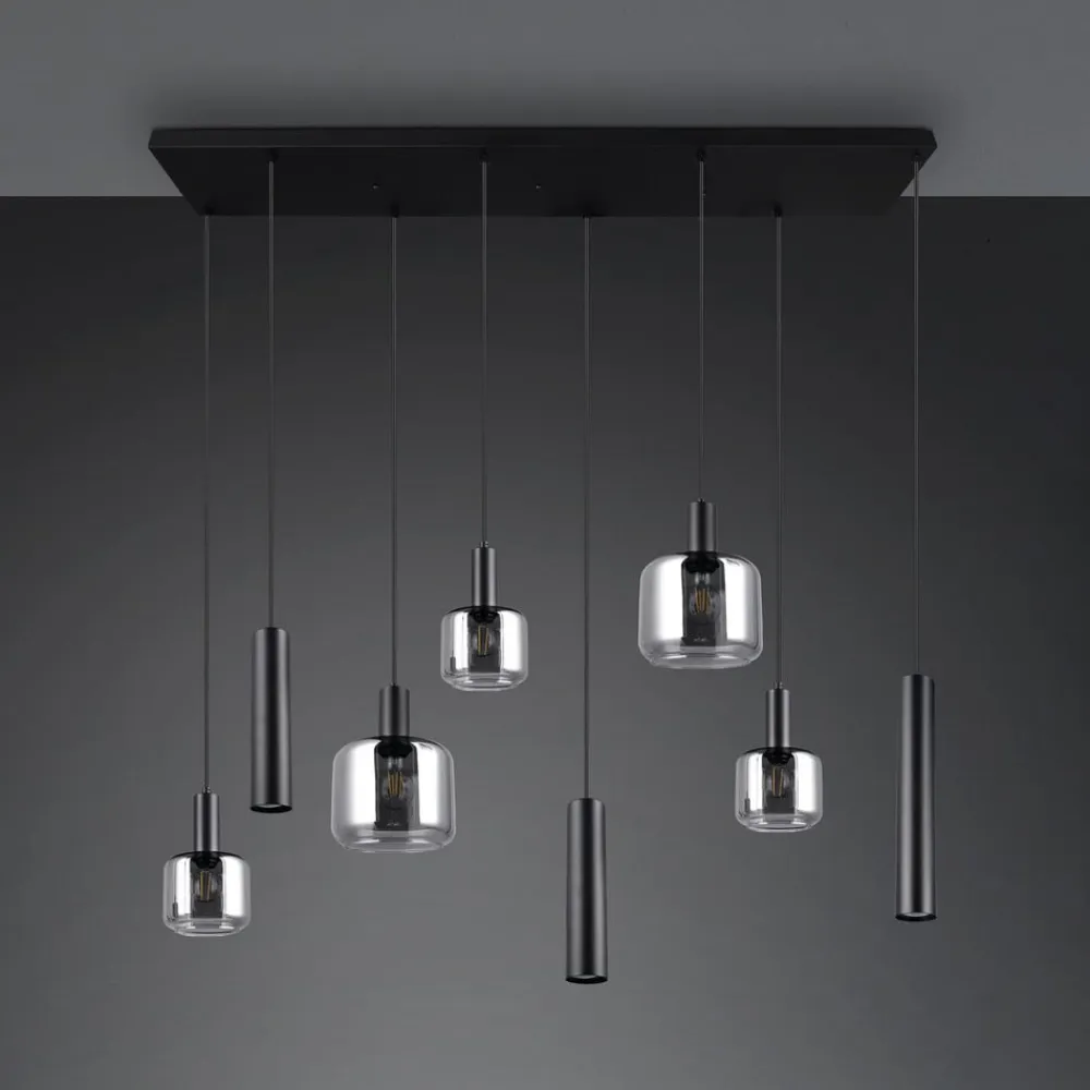 Mataro-pendel med 8 lyskilder – glas og metal i krom og sort Mataro er en moderne pendel med otte lyspunkter, der kan bruges som en central lyskilde i rummet. De otte pendler er placeret under en sort, rektangulær baldakin. Tre sorte metalcylindre er hver udstyret med en GU10-fatning; der er også fem runde lampeskærme af kromfarvet tonet glas, hvoraf tre har en E14-fatning og to har en E27-fatning.