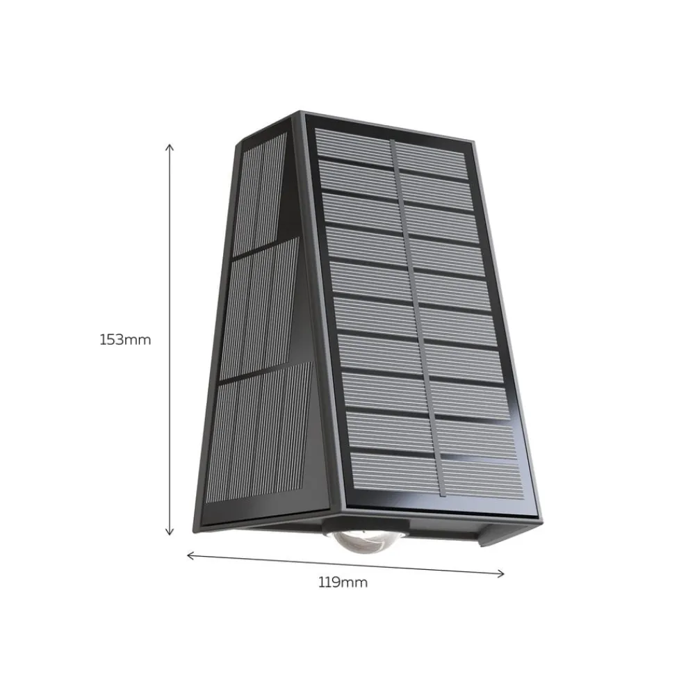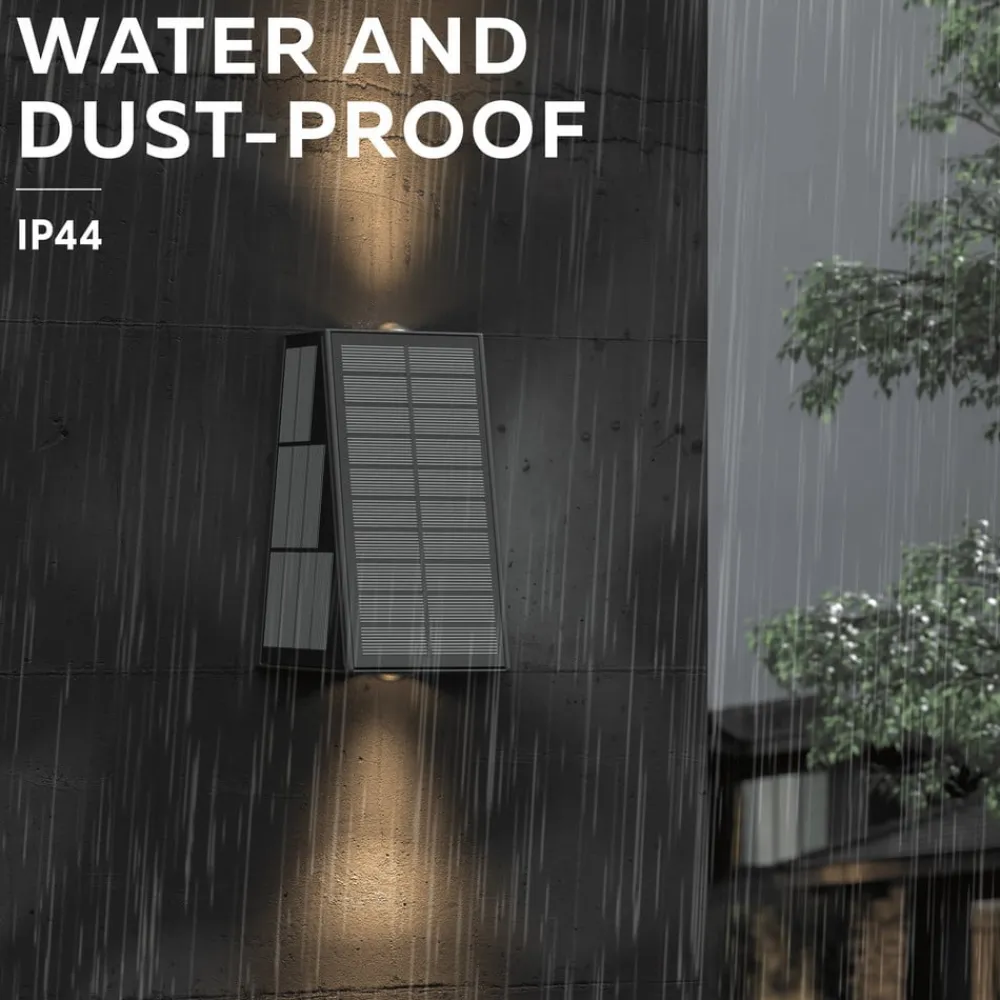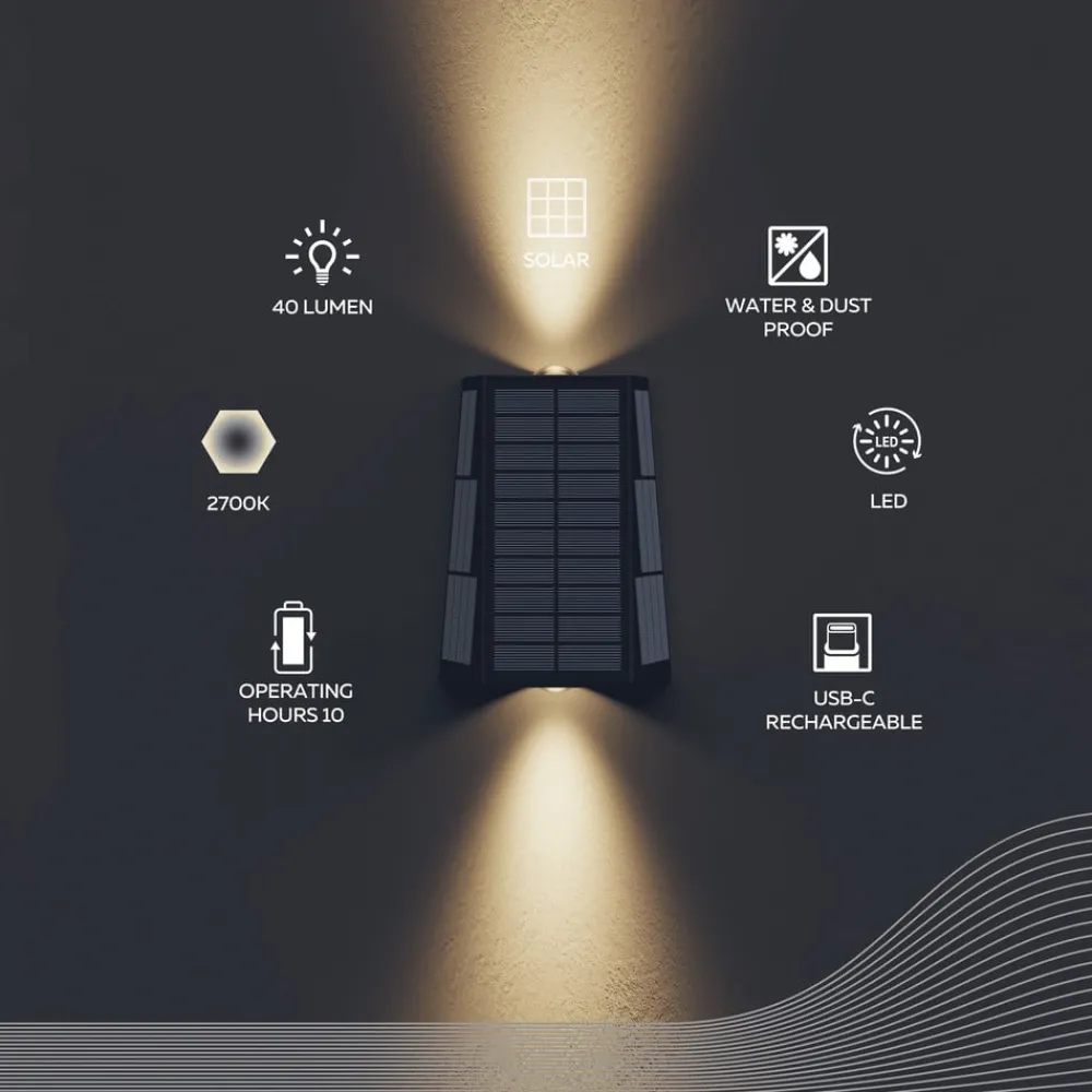 Den udendørs LED-væglampe Matera drives udelukkende af solenergi og oplades automatisk i løbet af dagen – ideel til facader, hegn og havemure. På dage med lidt sollys kan lampen nemt oplades via det medfølgende USB-C-kabel. Matera væglampe udsender varmhvidt lys både opad og nedad. Med IP44-certificering er lampen beskyttet mod regn og fugt – perfekt til permanent udendørs brug. Det robuste hus garanterer lang levetid og pålidelighed i al slags vejr. Lampen leveres med monteringsbeslag og kan nemt fastgøres på enhver udvendig væg. Det integrerede 2x 1200mAh batteri giver op til 10 timers lys efter 4-6 timers opladning.