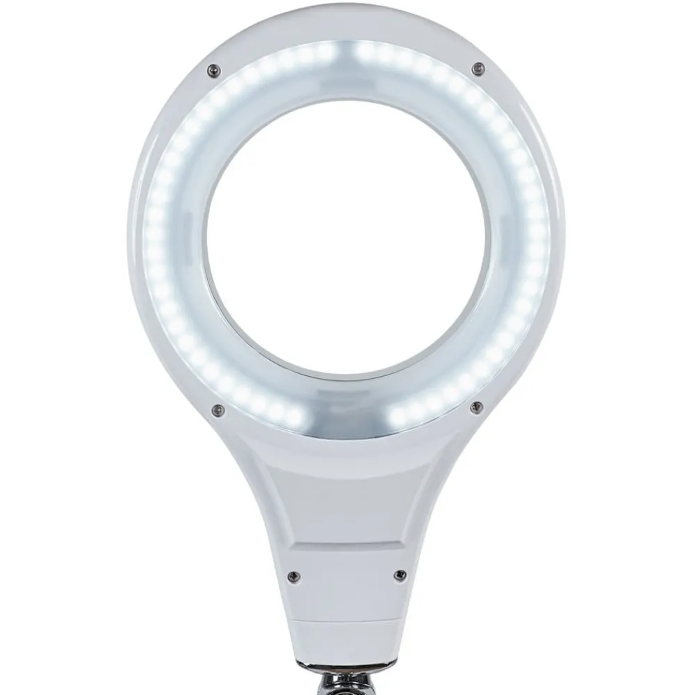 MAULmakro LED-forstørrelseslampe med stativ – alsidig MAULmakro LED-forstørrelseslampen med sin robuste parallelogramarm og stativ er ideel som en praktisk arbejdslampe til laboratorier, tekniske kontorer, værksteder eller til skrivebordet derhjemme. Den er udstyret med en 3-dioptrisk linse (1,75x forstørrelse, Ø 12,7 cm). Linsearealet er 144 kvadratcentimeter. En beskyttelsesklap forhindrer støv og skadeligt sollys. Hovedet og armen kan vippes og drejes, så indstillingen altid kan justeres under arbejdet. Lyset er meget homogent takket være de ringformede LED’er. Lyset tændes/slukkes med kontakten, der er indbygget i hovedet – Med diffuser for minimal skygge – Hovedet kan justeres i tre dimensioner – Intet strømforbrug, når belysningen er slukket – Belysningsstyrke: 2220 lux på 35 cm afstand