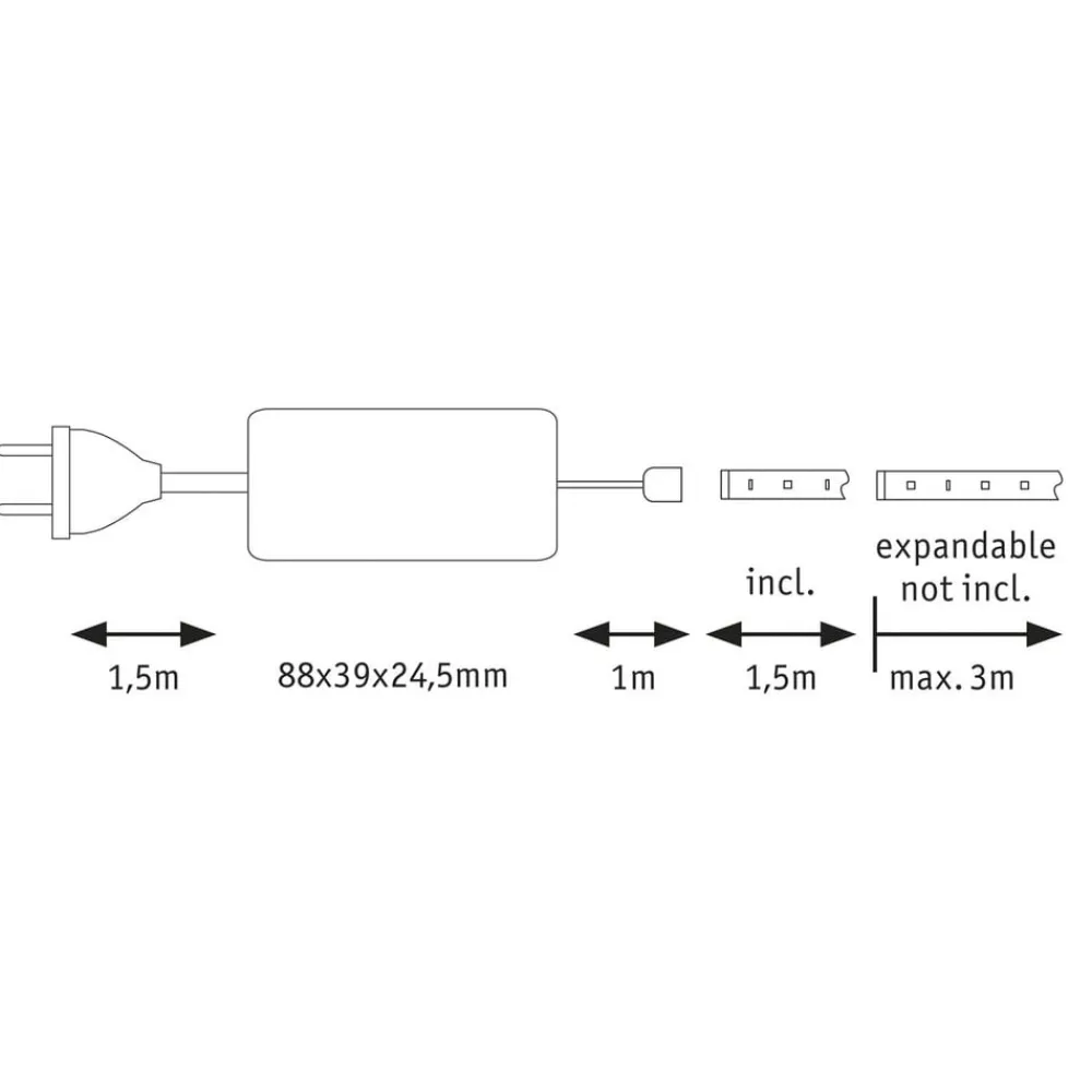 Med MaxLED 500 LED strip basissættet kan der realiseres mange forskellige rumbelysninger, fordi den kraftige strip giver mulighed for at lave et lysmønster på forskellige overflader efter behov. Dette er muligt på den ene side på grund af den selvklæbende underside og på den anden side på grund af båndets fleksibilitet. Basissættet indeholder en passende ballast, og sættet kan også udvides med forlængelseslister (se tilbehør). En passende fjernbetjening til at skifte eller dæmpe lysstyrken fås også separat.