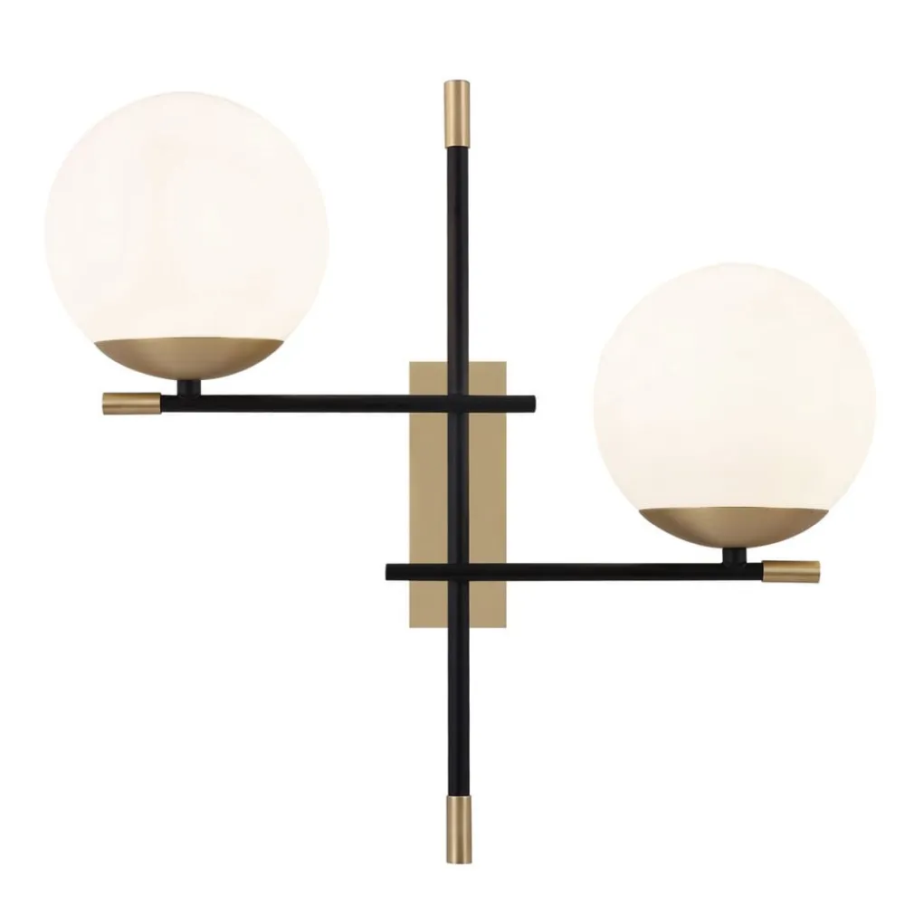 Tre lige linjer, et rektangel og to kugler bestemmer udseendet på den to-flamme nostalgi: væglampen med det rektangulære vægbeslag, rammestængerne krydses på to punkter, og de to kugler lavet af mælkeglas fungerer ikke kun som en kilde til atmosfærisk ekstra belysning i et moderne levende miljø, men også som et dekorativt element, der understreger stilen. Rammens harmoniske farveskema i matguld og sort giver en interessant kontrast til det hvide på glaskuglerne.