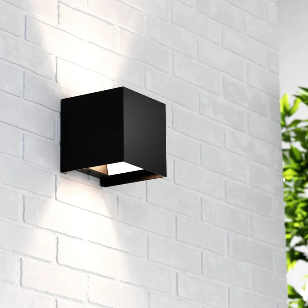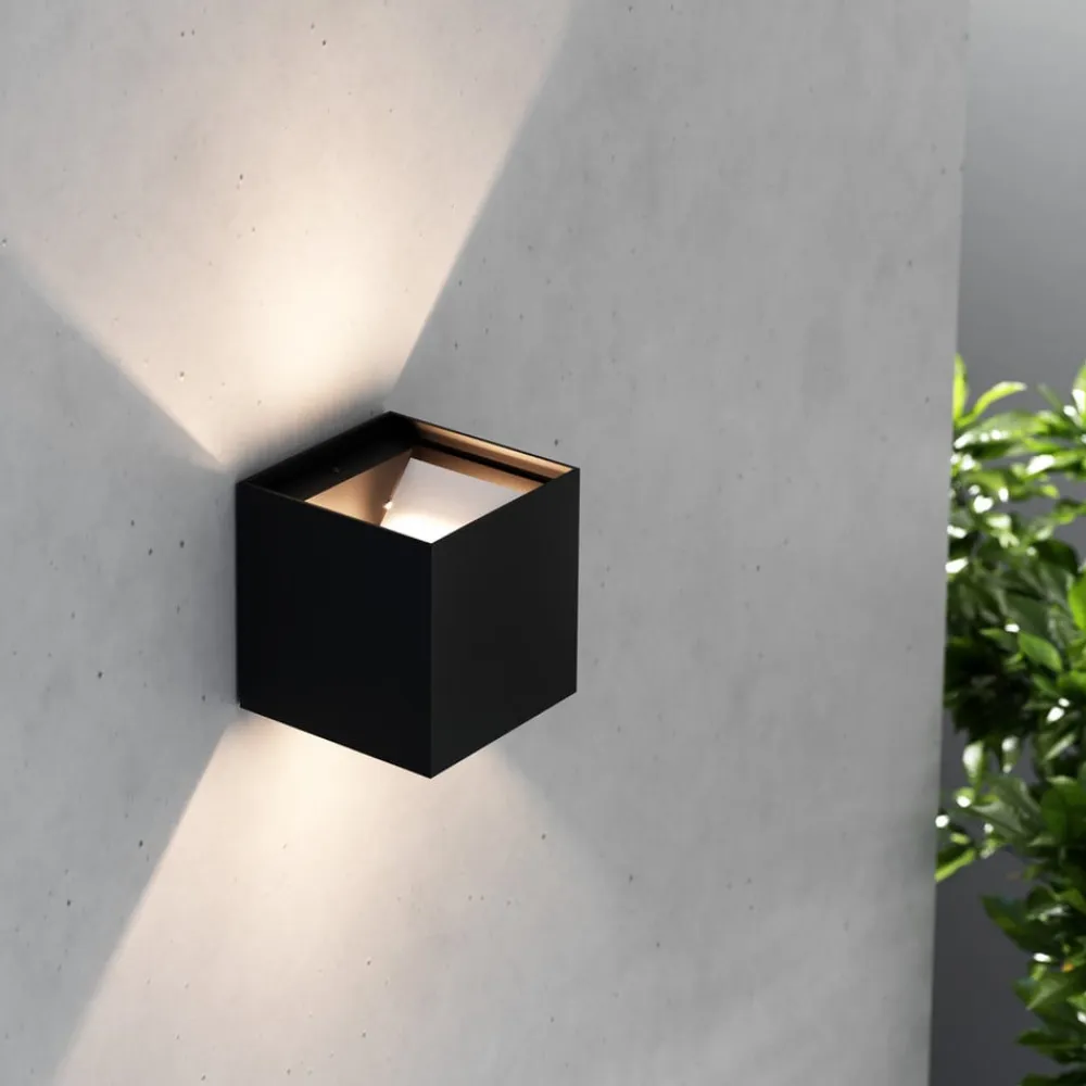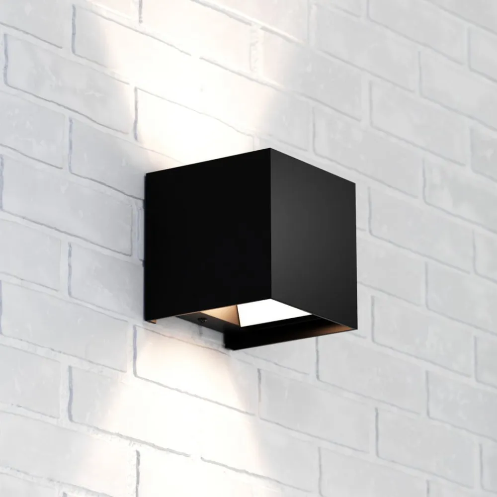 Kubusformet Zuza 2-væglampe, fordeling i top og bund Zuza 2-væglampen, der er fremstillet af metal i en enkel kubusform, er udstyret med en G9-fatning inde i kroppen. Lyset fra den pære, der skal bruges, sendes ud gennem åbningerne i toppen og bunden, med fire hængslede vinger, der gør det muligt at justere strålevinklen individuelt.