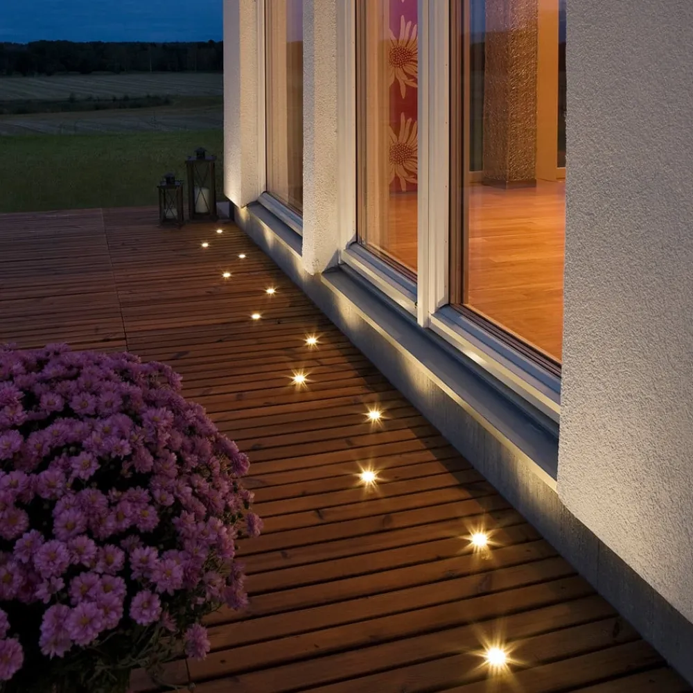 Dette energibesparende LED nedgravningsspot spotlight-sæt består af seks varmhvide spots. Det skaber en fantastisk atmosfære i det udendørs område og er især velegnet til stemningsfuld belysning af terrasser eller stier. Spotlightsene kan tåle op til 100 kg. Installationsdybden er 4 cm. Den synlige plade er lavet af rustfrit stål, den indbyggede krukke er lavet af vejrbestandig plast. Sættets samlede længde er 21 meter. En transformer (IP44) er inkluderet.