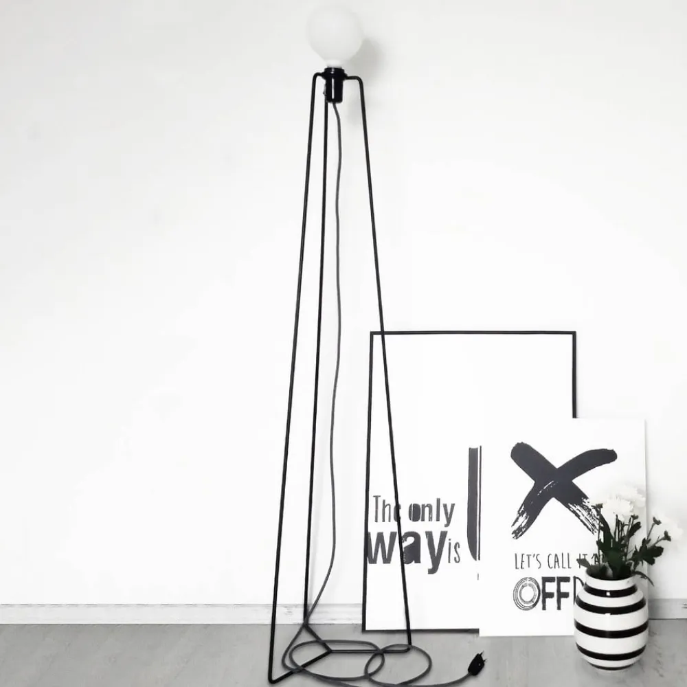 LED-gulvlampe Model M3 med filigran trefodet stålramme og opalglasskærm i form af en stor pære