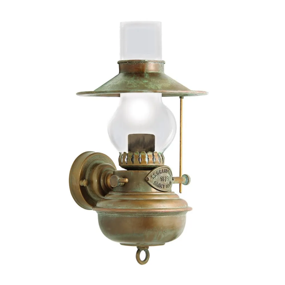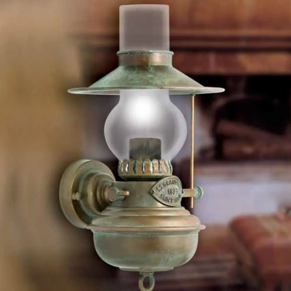 Guadelupa – væglampe i antikt designDen ekstremt rustikt udseende Guadelupa-væglampe er modelleret efter en olielampe og har en individuel charme. Det transparente dækglas i midten er flankeret af en formfuldendt messingskærm, som er forbundet med lampens nederste del med en stang. En påsat plade med årstallet 1873 forstærker effekten af en antik olielampe.