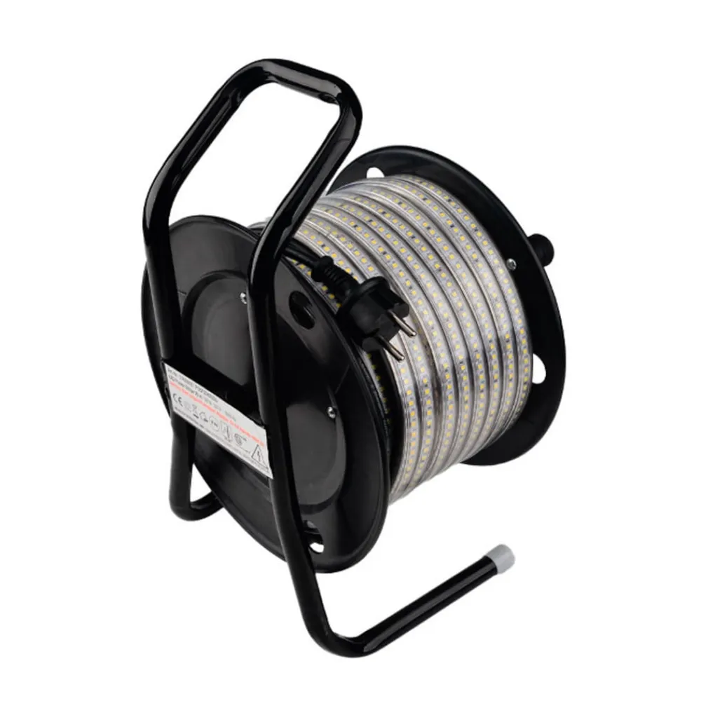 LED-strip til udendørs brug med IP65 og stik Denne LED-strip, som leveres på en kabelrulle med forsyningskabel og stik, er den ultimative belysningsløsning til professionel udendørs brug. Den ekstra lyse og kraftige LED-strip fra Müller-Licht tilbyder den perfekte kombination af robusthed, fleksibilitet og brugervenlighed. Uanset om det er på byggepladser, i lagerhaller, festkældre eller til hurtig belysning af sportsfaciliteter, arrangementer og udendørsarealer – denne LED-strip er altid det rigtige valg. Med imponerende lysstyrke og dagslys-hvidt lys giver LED Power Strip en ensartet belysning. Takket være den praktiske kabelrulle og den enkle plug-and-play-løsning er den klar til brug med det samme – rul ud, oplys, rul sammen, færdig! LED-strippen er ikke kun ekstremt robust og fleksibel, men også specielt designet til indendørs og udendørs brug. Med beskyttelsesklasse IP65 og slagfasthed på IK08 modstår den ubesværet de mest krævende forhold.