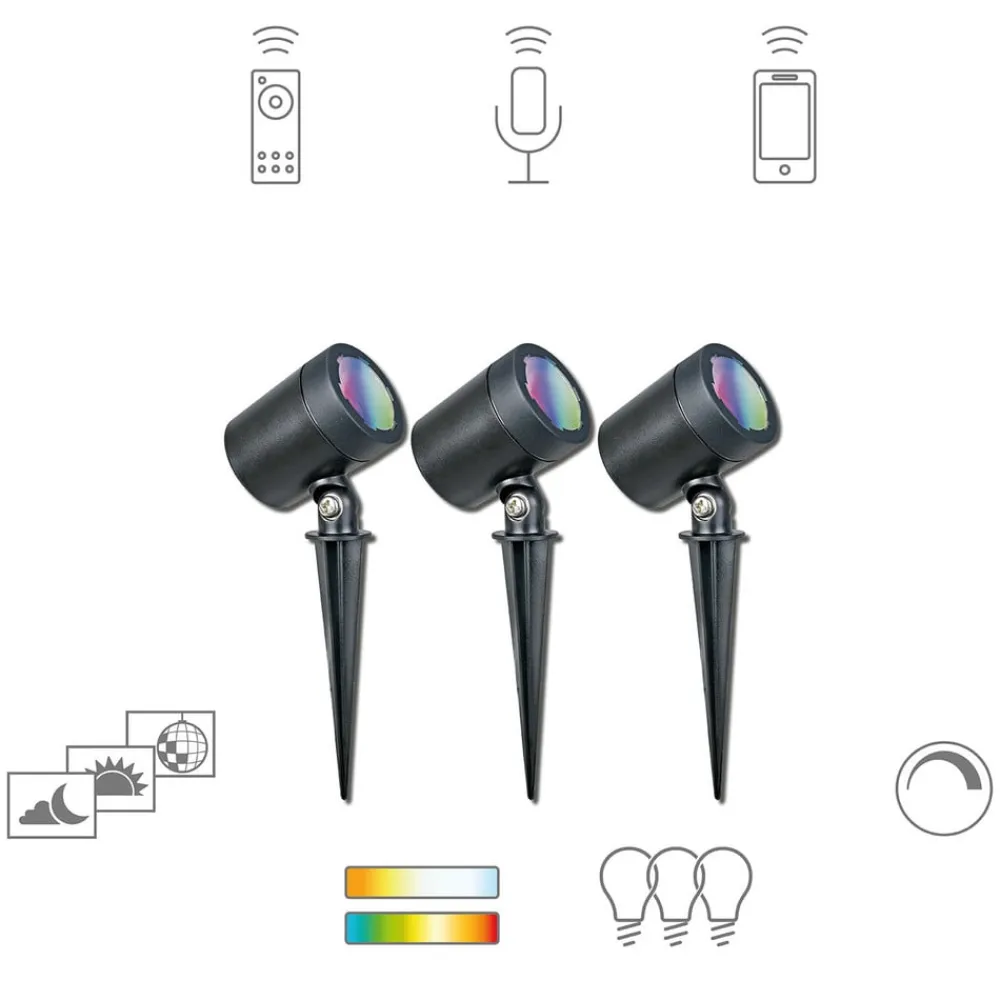 Flores LED udendørsspot med jordspyd i praktisk sæt med 3 stk – kan styres med fjernbetjening, app eller stemmeassistent Den moderne Flores LED udendørsspot er udstyret med et jordspyd for nem installation. Det betyder, at de nemt kan installeres overalt i haven og udendørs. Spotlamperne er udstyret med et toningsstyringsmodul og giver farverigt og hvidt lys i forskellige temperaturområder med deres integrerede LED’er. Uanset om det er varmhvidt eller dagslys, kan den rigtige lysstemning vælges når som helst og til enhver lejlighed. Indstillingerne foretages enten med en passende tint-fjernbetjening eller via forbindelsen til et ZigBee smart home-system med en kompatibel app. Stemmestyring med stemmeassistenten Alexa er også mulig. Derudover kan hver lampe styres individuelt, så der kan indstilles individuelle farveaccenter. Sættet med 3 lamper kan udvides til op til 5 lamper, så den moderne og smarte Flores LED udendørsspot kan bringe farve til haven. Det praktiske sæt med 3 lamper kan bruges på mange forskellige måder, uanset om det er til belysning af udvalgte områder eller blot til belysning. Takket være den høje grad af beskyttelse er spottene støvtætte og beskyttet mod vandstråler, så de kan bruges overalt uden tøven. Funktioner/kompatibilitet: – kan styres via en passende tint-fjernbetjening (se tilbehør) – kan styres via app baseret på ZigBee radiostandard 3.0 – kompatibel med stemmeassistenten Alexa (Amazon) – kan integreres i ZigBee-baserede smart home-systemer, for eksempel med Philips Hue, Osram Lightify etc. – forskellige hvide toner (1800-6500 K) og op til 16 millioner farver kan indstilles – dæmpbar i alle valgte lysfarver – kan udvides til maksimalt 5 havespots (udvidelse fås separat) – hver lampe kan styres individuelt – beskyttelsesklasse IP44 (stænktæt)