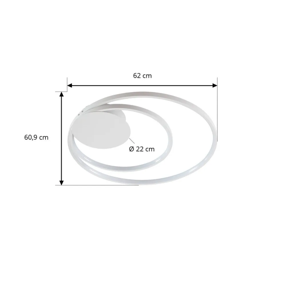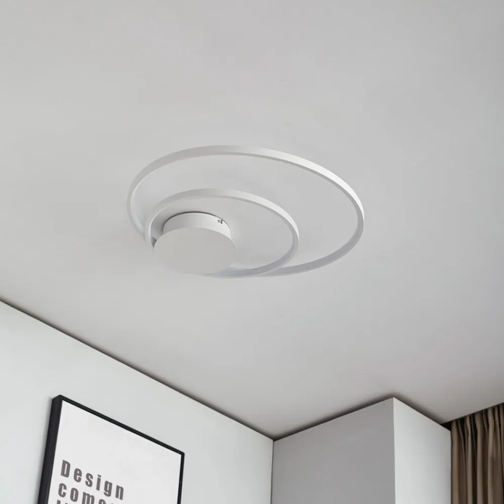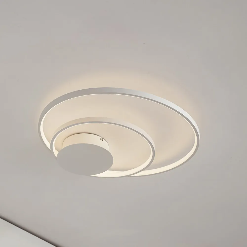 Rund, hvid LED-loftlampe Nerwin med to ringe, dæmpbar via kontakt Nerwin imponerer ikke kun med, at lyset kan dæmpes i tre trin ved hjælp af den normale kontakt, men også med et flot udseende, der passer perfekt til moderne interiør. LED-loftlampens aluminiumshus er helt hvidt, hvilket skaber et særligt harmonisk look, og armaturet består af en stor og en lille ring samt et rundt loftbeslag, som er placeret i siden i stedet for i midten. Et belysningsobjekt med et helt igennem æstetisk udseende! 3-trins dæmpbar + off: Lyset kan tændes og slukkes som sædvanligt ved hjælp af en vægkontakt. Takket være 3-trins-dæmpningsteknologien med integreret slukfunktion kan den også dæmmes til tre forskellige lysstyrkeniveauer ved at trykke på kontakten flere gange: 100 %, 50 % og 25 %.