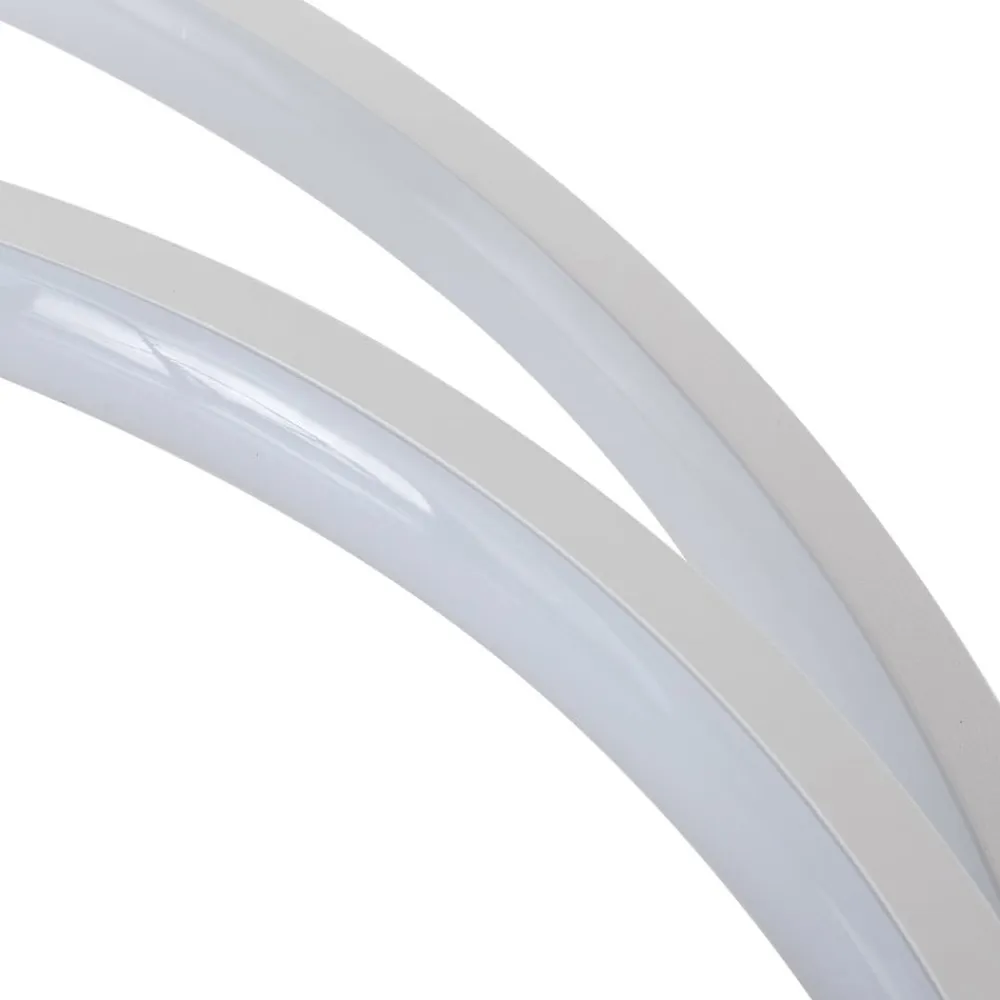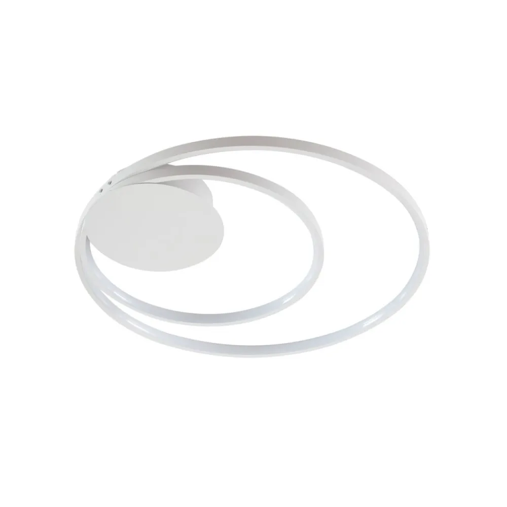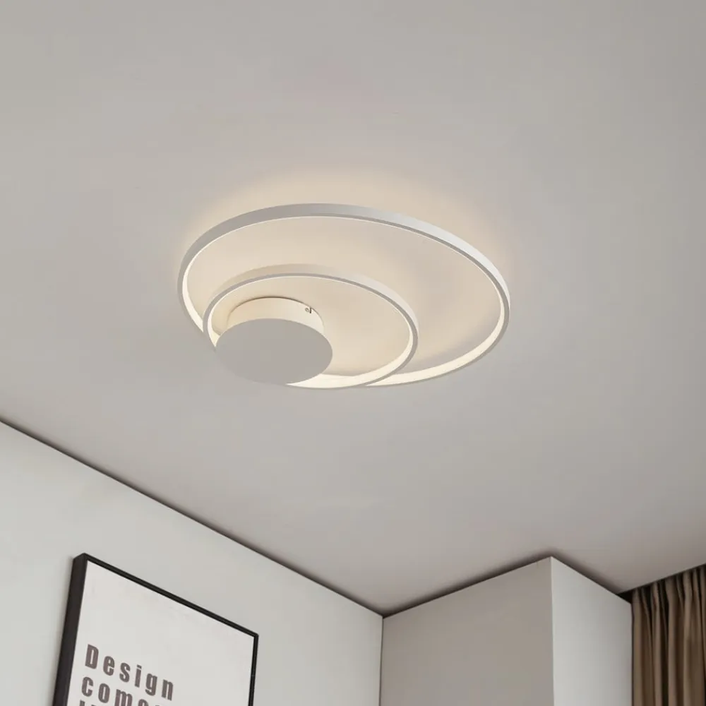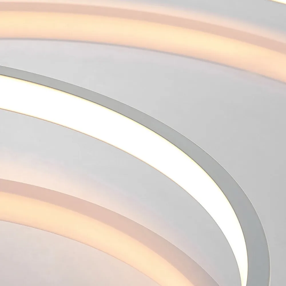 Rund, hvid LED-loftlampe Nerwin med to ringe, dæmpbar via kontakt Nerwin imponerer ikke kun med, at lyset kan dæmpes i tre trin ved hjælp af den normale kontakt, men også med et flot udseende, der passer perfekt til moderne interiør. LED-loftlampens aluminiumshus er helt hvidt, hvilket skaber et særligt harmonisk look, og armaturet består af en stor og en lille ring samt et rundt loftbeslag, som er placeret i siden i stedet for i midten. Et belysningsobjekt med et helt igennem æstetisk udseende! 3-trins dæmpbar + off: Lyset kan tændes og slukkes som sædvanligt ved hjælp af en vægkontakt. Takket være 3-trins-dæmpningsteknologien med integreret slukfunktion kan den også dæmmes til tre forskellige lysstyrkeniveauer ved at trykke på kontakten flere gange: 100 %, 50 % og 25 %.