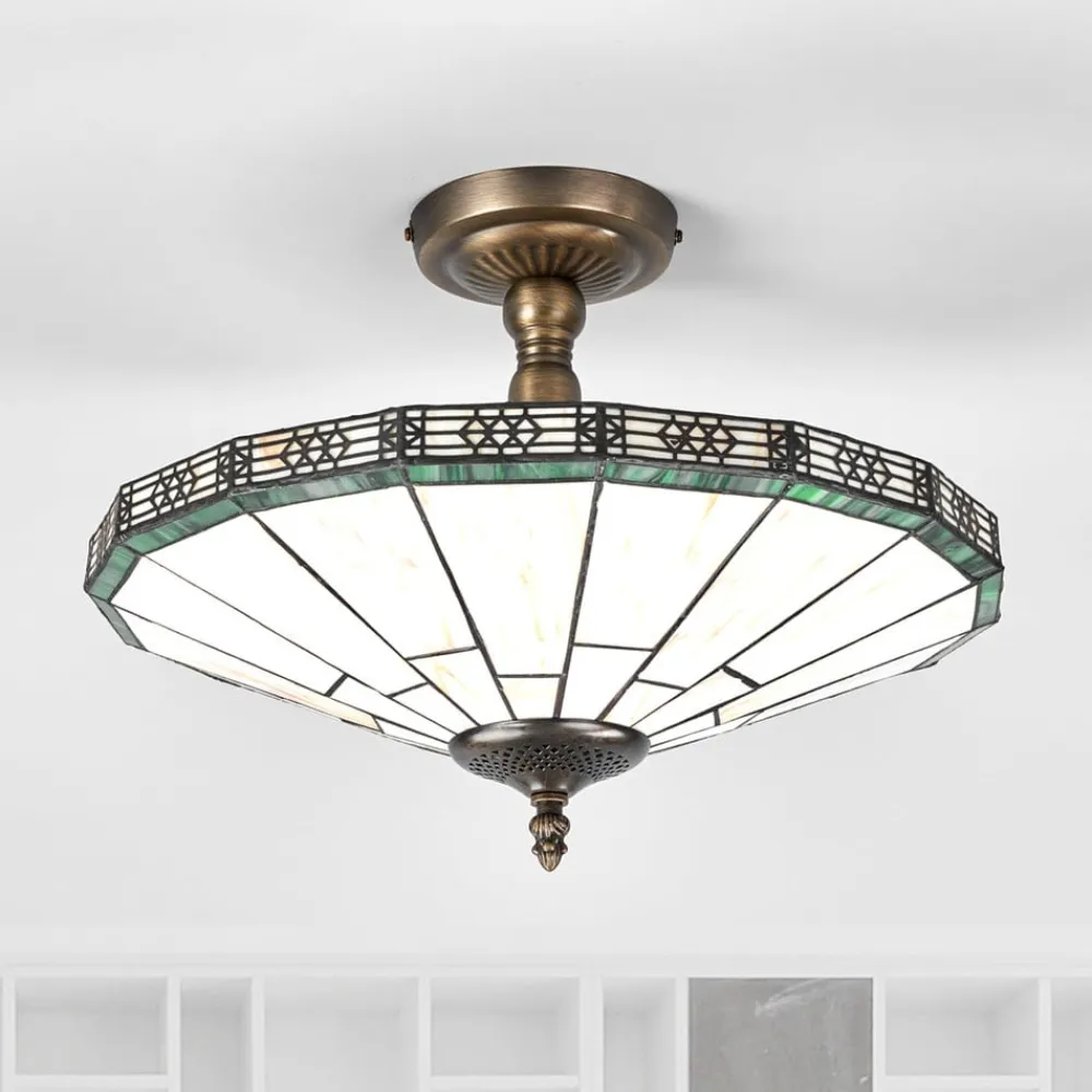 De, der elsker klassisk design, vil blive mere end begejstret for loftslampen New York. Den store skærm er udformet i Tiffany-stil og er sammensat af mange individuelle Tiffany-glaselementer. Loftslampen giver således et behageligt lyst lys i hele rummet. Stellet i gammel messing supplerer harmonisk det elegante design.