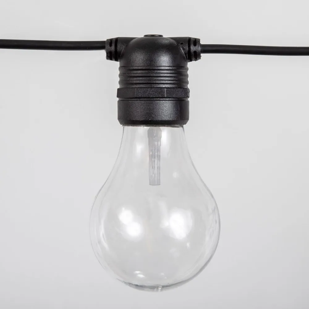 LED-lyskæde Allegra med 10 lamper og fjernbetjening Den sorte lyskæde Allegra er udstyret med 10 klare lamper i retrodesign, som kan lyse i varmt hvidt lys med 3.000 K eller i farvet lys. Den robuste lyskæde i plast leveres med en fjernbetjening. Fjernbetjeningen kan bruges til at skifte lyset til farveskiftende lys eller fire forskellige lysindstillinger – Samlet længde 8 meter – Kabellængde til første stikkontakt 3,25 meter – Afstand mellem stikkontakter 5 cm
