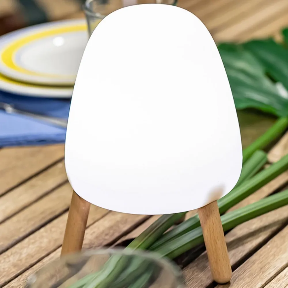 Lille, batteridrevet LED-bordlampe Rocket 20 Den lille, batteridrevne LED-bordlampe Rocket 20 i et smukt design med en trebenet træramme og en hvid silikoneskærm er en perfekt borddekoration i private eller cateringmiljøer. Uanset om det er indendørs eller udendørs – takket være IP43-beskyttelsesgraden – kan Rocket LED-bordlampen bruges til at dekorere og oplyse ethvert bord. LED’erne i lampen udsender en varm hvid lysfarve og kan skiftes til tre lysstyrkeniveauer ved hjælp af en touch-funktion på skærmen. Afhængigt af den valgte lysstyrke lyser bordlampen i mellem 6 og 20 timer. Leveringen omfatter et mikro-USB-ladekabel, som kan bruges til at genoplade batteriet på en powerbank eller med en passende adapter (medfølger ikke) ved stikkontakten – Lysvarighed 6 til 20 timer afhængigt af lysindstillingen – Batteri 1 x 1200 mAh lithium – Opladningstid 4 til 6 timer – Mikro-USB-ladekabel medfølger, adapter til stikkontakten medfølger ikke