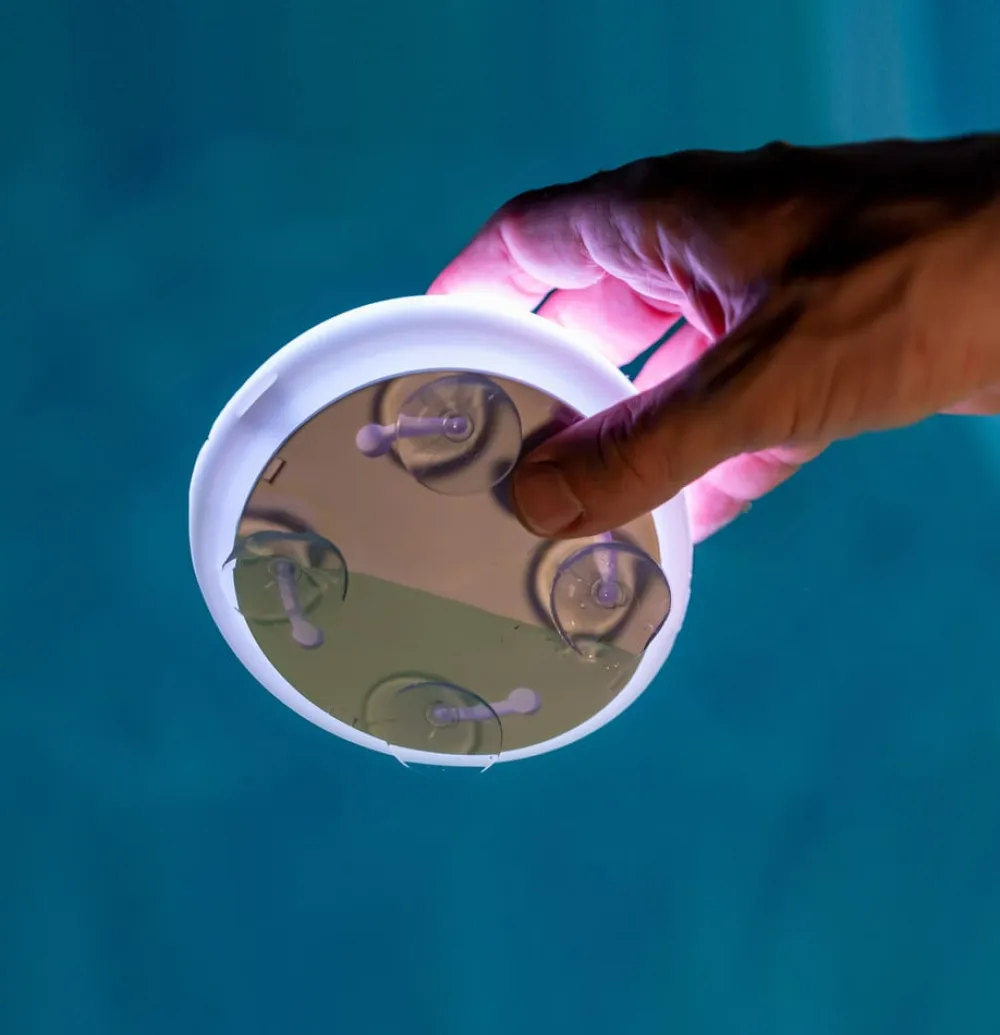 Vandtæt genopladelig LED-poolbelysning Papaya Den genopladelige Papya LED-poolbelysning er en ledningsfri belysning, der er specielt udviklet til poolbelysning. Takket være det kompakte og vandtætte design kan den nedsænkes op til 1 meter under vand (IP 68). Papaya har en fjernbetjening, som kan bruges til at styre lyset. Papaya kan installeres på to måder: med aftageligt klæbemiddel eller med sugekopper, så den kan installeres i alle typer pools, uanset om de er flisebelagte, grusbelagte eller af andre materialer. Det kan også bruges som et dekorativt flydende lys, bordlys eller gulvlys. Opladningstilstand: Papaya har et magnetisk opladningssystem, en sikker opladningstilstand for vandprodukter. Armaturet skal bare fjernes fra poolen, så tørres armaturets opladningsområde, og armaturet er 100% opladet på ingen tid – Inkluderer monteringsmateriale, ladekabel (uden strømforsyningsenhed) og fjernbetjening – Farveskift og dæmpning via fjernbetjening