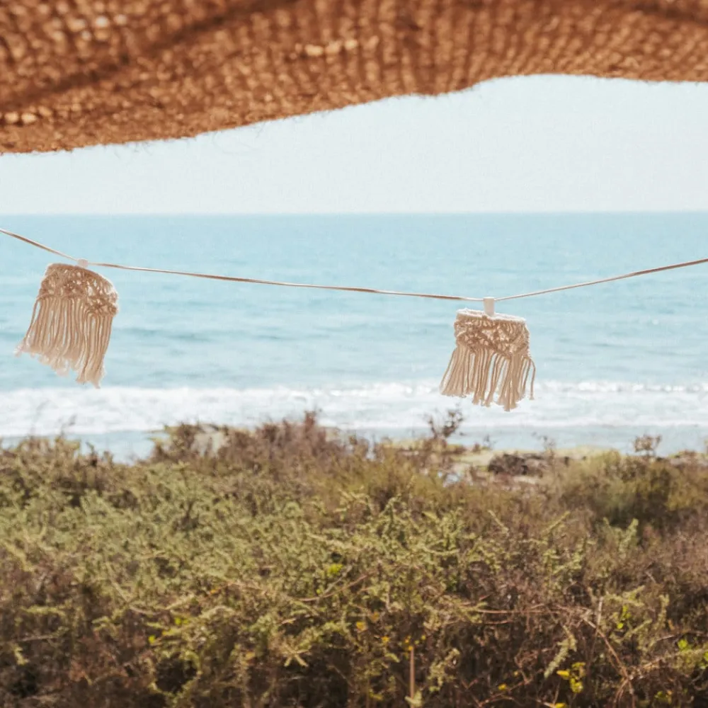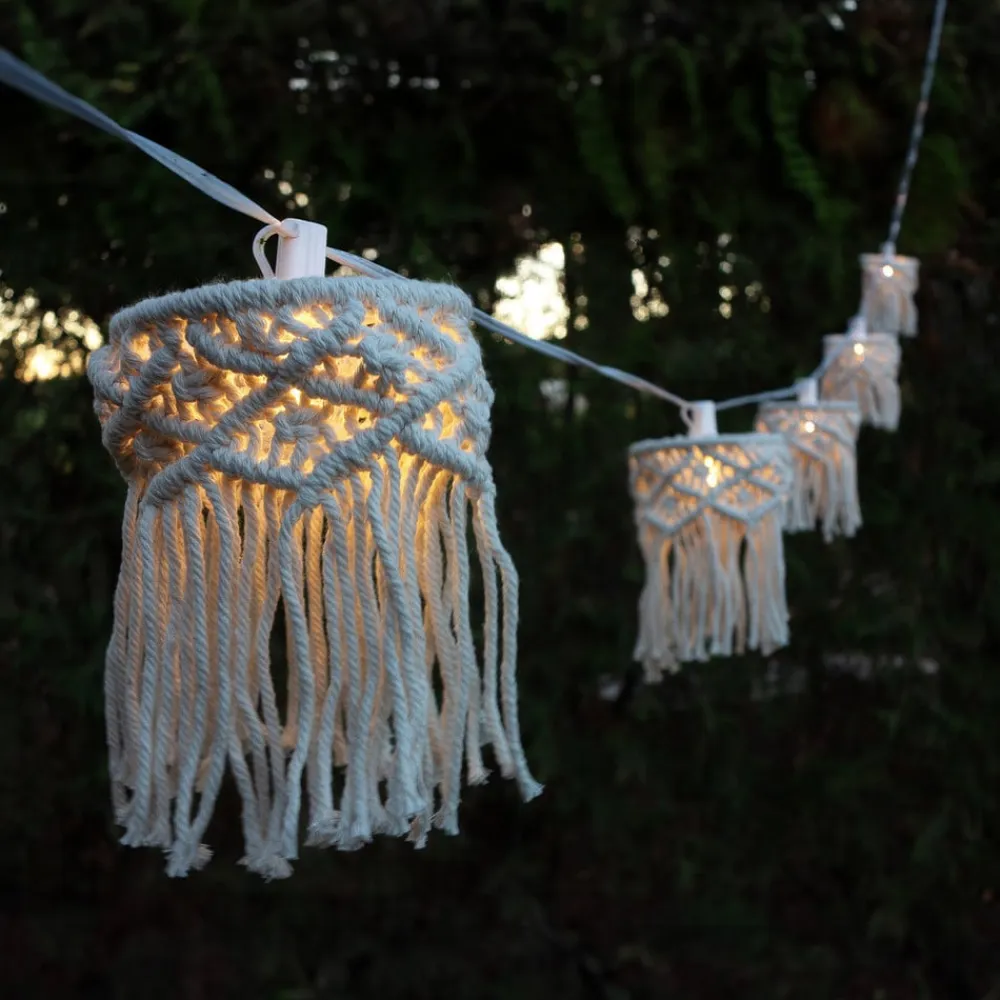 8 lyskilder Mykonos med solpanel og til opladning De dekorative, sommerlige Mykonos lyskæder med skærme af hæklet bomuld kan oplades ved hjælp af solenergi eller via en stikkontakt (USB-C-kabel medfølger, netadapter medfølger ikke). LED-pærerne medfølger, men kan udskiftes.