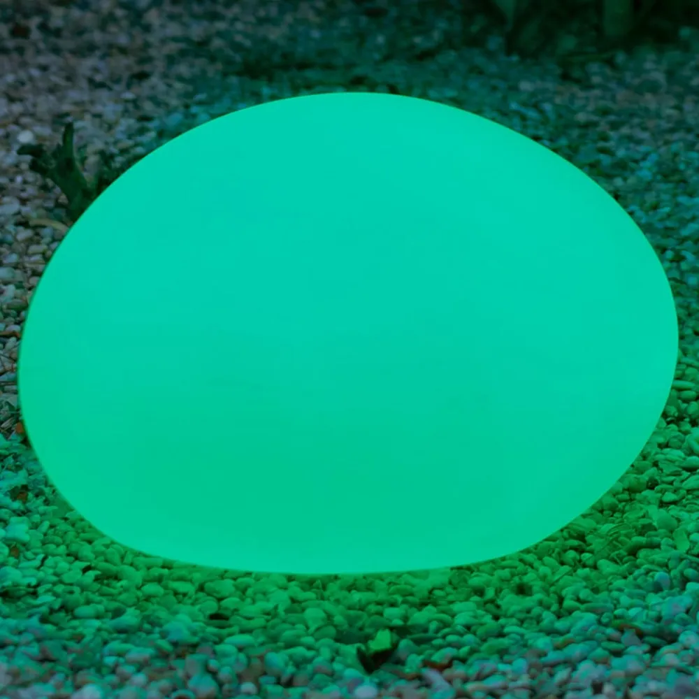 Skinnende sten – Petra LED-solcellelampe med ladekabel Petra er en dekorativ LED-lampe med solpanel og integreret genopladeligt batteri, designet i form af en stor sten. Den er et af mange produkter fra den spanske lampeproducent Newgarden, og som næsten alle mærkets lamper er den lavet af polyethylen. Dette plastmateriale er ikke kun 100 % genanvendeligt, det er også slidstærkt og UV-resistent. Materialet er upåvirket af ekstreme temperaturer og sollys. Lampen er beskyttet mod indtrængen af støv og vandstråler med beskyttelsesklasse IP65 og kan derfor uden tøven bruges overalt udendørs. Lampen leveres med en fjernbetjening og et ladekabel til genopladning af batteriet ved stikkontakten. Fjernbetjeningen kan bruges til at indstille lysfarven fra utallige klare farver eller hvidt lys og justere lysstyrken. Stenens gennemskinnelige materiale lyser lyset jævnt og lader det forsigtigt trænge udad – Genopladeligt batteri 1 x 2000 mAh lithium – Lysvarighed 12 til 36 timer afhængigt af lysindstillingen – Opladningstid 4 til 6 timer – Inkluderer 1,5 m ladekabel og IR-fjernbetjening