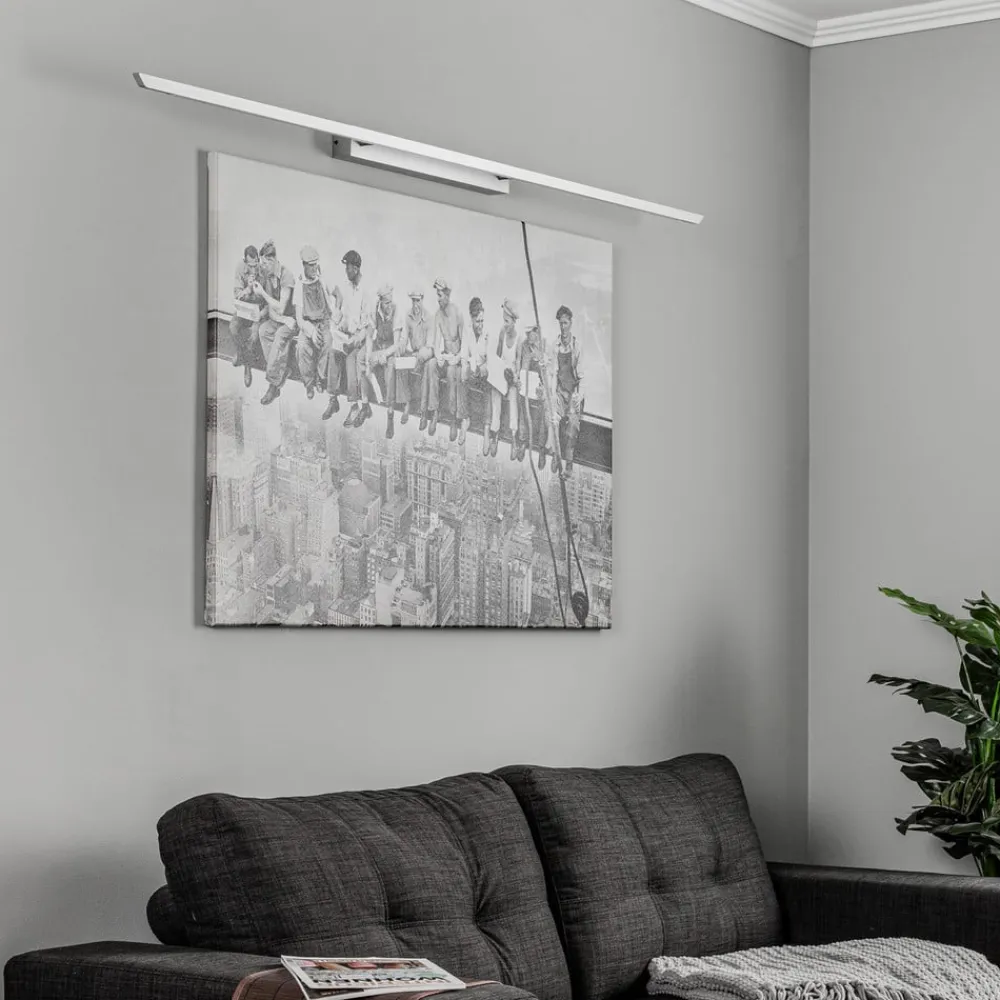 Dæmpbar Niara LED-gallerilampe med CCT-funktion Niara-gallerilampen imponerer med sit slanke design og sætter ethvert billede eller dekorativt objekt perfekt i scene. Den er lavet af aluminium, messing og akryl i høj kvalitet. Overfladen er omhyggeligt udformet i hånden. Gallerilampen har også et praktisk vippeled, der gør det muligt at justere lysets strålevinkel individuelt. Den integrerede dæmpbare og CCT-funktion er også særlig bemærkelsesværdig. Lysstyrken kan justeres til det ønskede niveau ved hjælp af bevægelseskontrol. Det er også muligt at justere lysfarven fra varm hvid til universalhvid. Det betyder, at belysningen hurtigt og nemt kan tilpasses individuelle behov. Niara kan bruges både i private hjem og på museer eller gallerier.