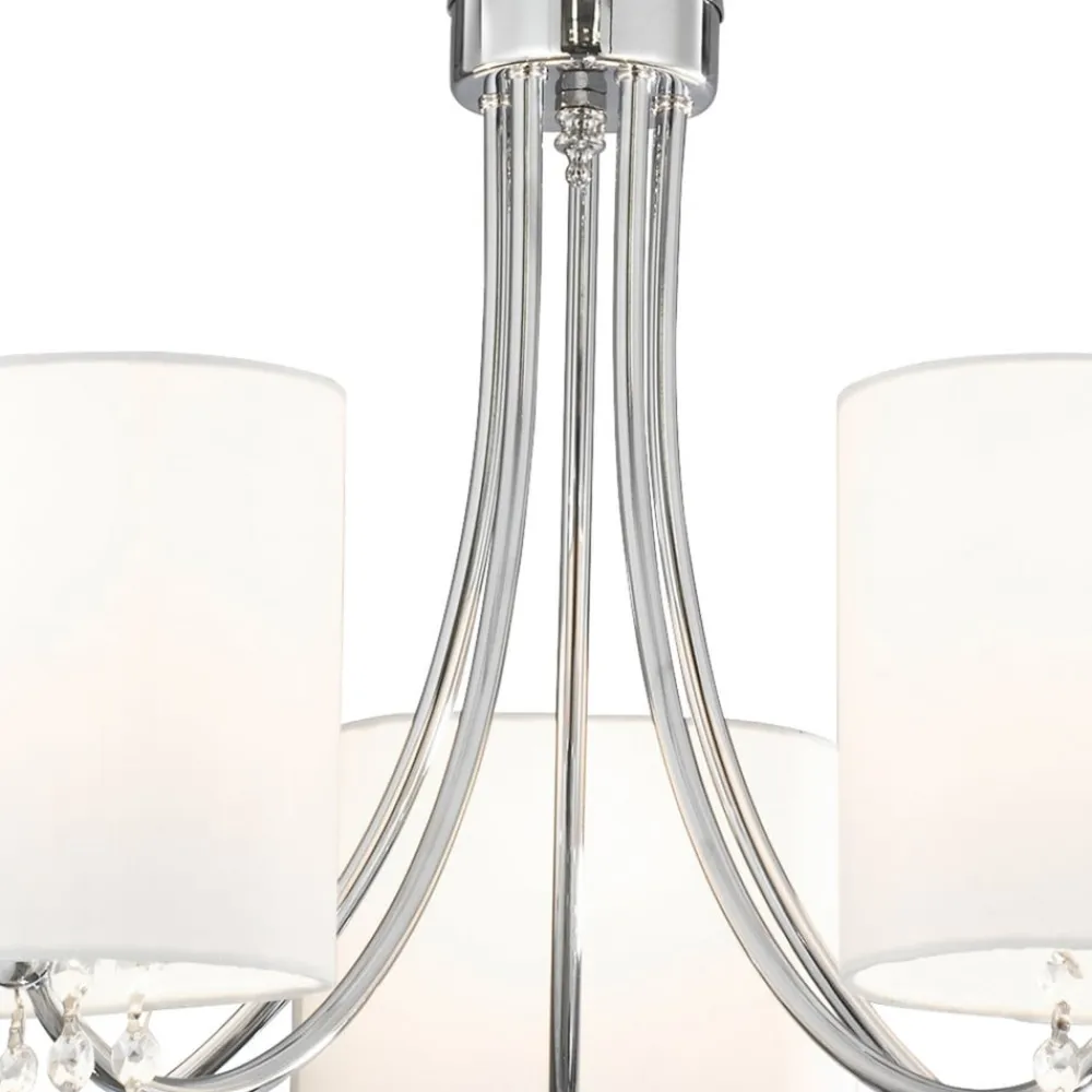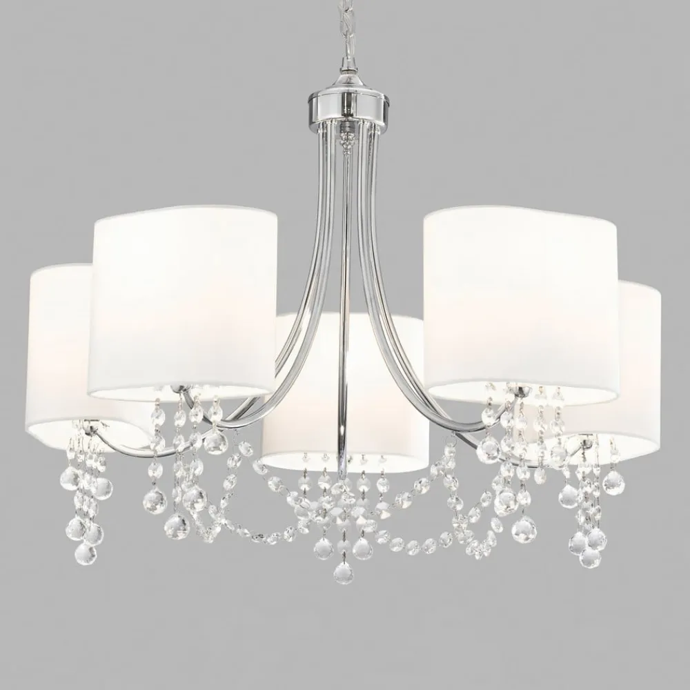 NINA lysekrone med hvide tekstilskærme og udførlig glaskrystalophæng