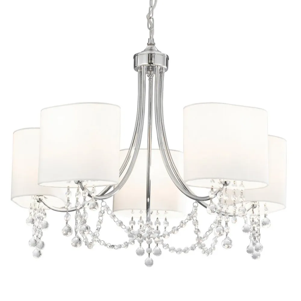 NINA-lysekronen er med sit enkle, men imponerende design et blikfang i enhver indretning. Fra den skinnende metalramme kommer fem buede arme frem, hvorpå der sidder enkle, hvide tekstilskærme. Disse sikrer en jævn og blændfri lysfordeling. Højdepunktet i NINA-lysekronen er dog den kunstfærdige ophængning af glaskrystalkugler, som får lampen til at skinne.