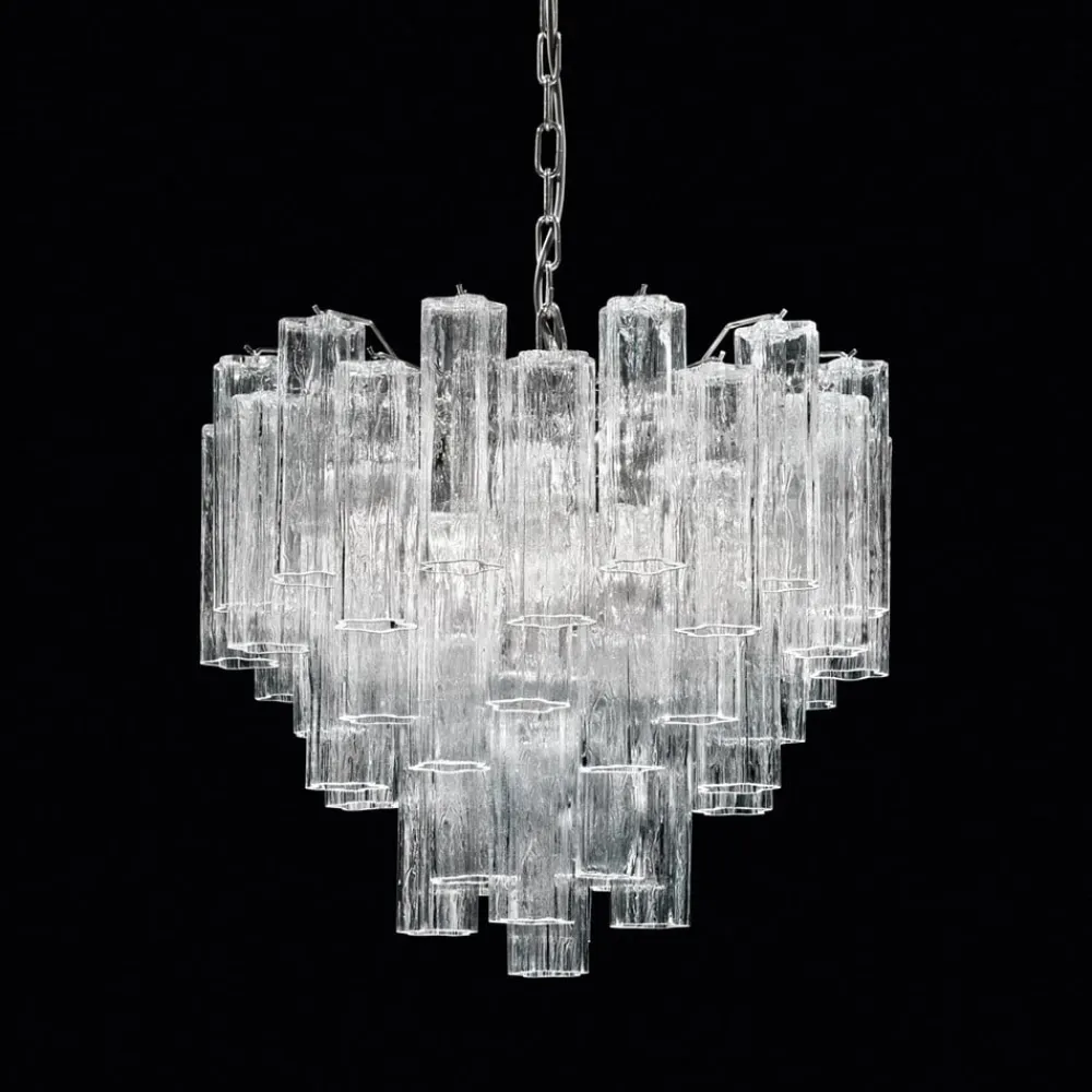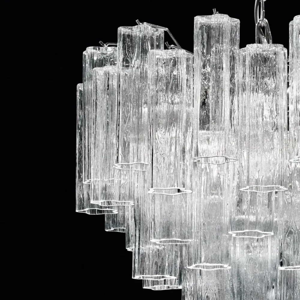 Udsøgt Tronchi-pendellampe med en kaskade af Murano-glaselementer Tronchi-pendellampen består af et væld af Murano-glascylindre af høj kvalitet i transparent farve. De skaber en fascinerende struktur med en usædvanlig smuk udstråling. Fem lyskilder inde i lampen giver dette glaskunstværk en spektakulær glans. Tronchi skaber en effektiv rumbelysning og supplerer den stilfulde stue.