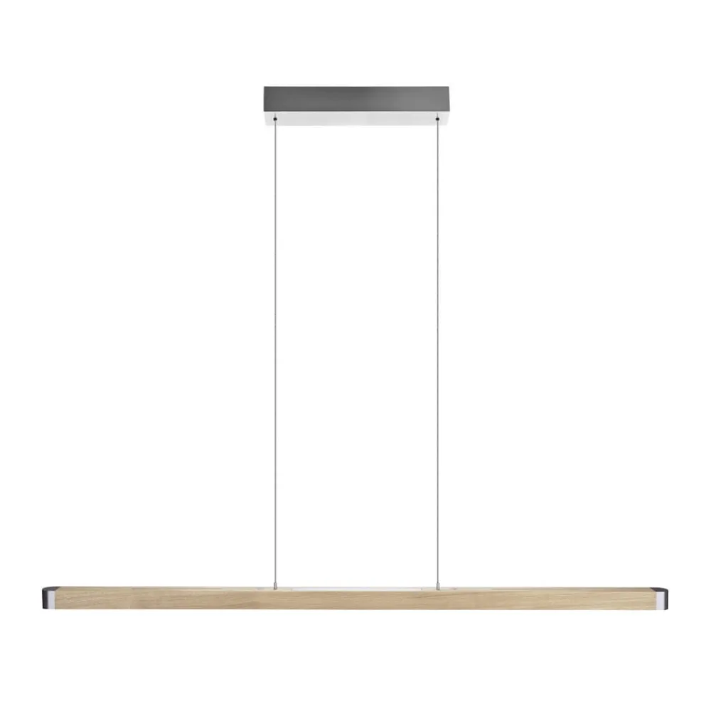 Slank LED-pendelarmatur Novelie med detaljer i mat nikkelFunktionelt såvel som visuelt præsenterer dette pendellysarmatur sig selv som en moderne og behagelig lyskilde. Lysdioder er integreret i toppen og bunden af den lange, terningformede træpendel. Uplight og downlight kan skiftes og dæmpes separat. Udstyret med en remskive giver en visuelt elegant mulighed for højdejustering. Slutkapper i bjælkens langsgående ender samt baldakinen i mat nikkel giver Novelie en moderne karakter.- bæredygtigt træ fra FSC-certificerede leverandører- god farvegengivelse: CRI > 90- dim-to-warm: lysfarven ændres ved dæmpning – universalhvid (4.000 K) med den højeste lysudbytte, varm hvid (2.200 K) med den laveste lysudbytte.- fremstillet i Tyskland