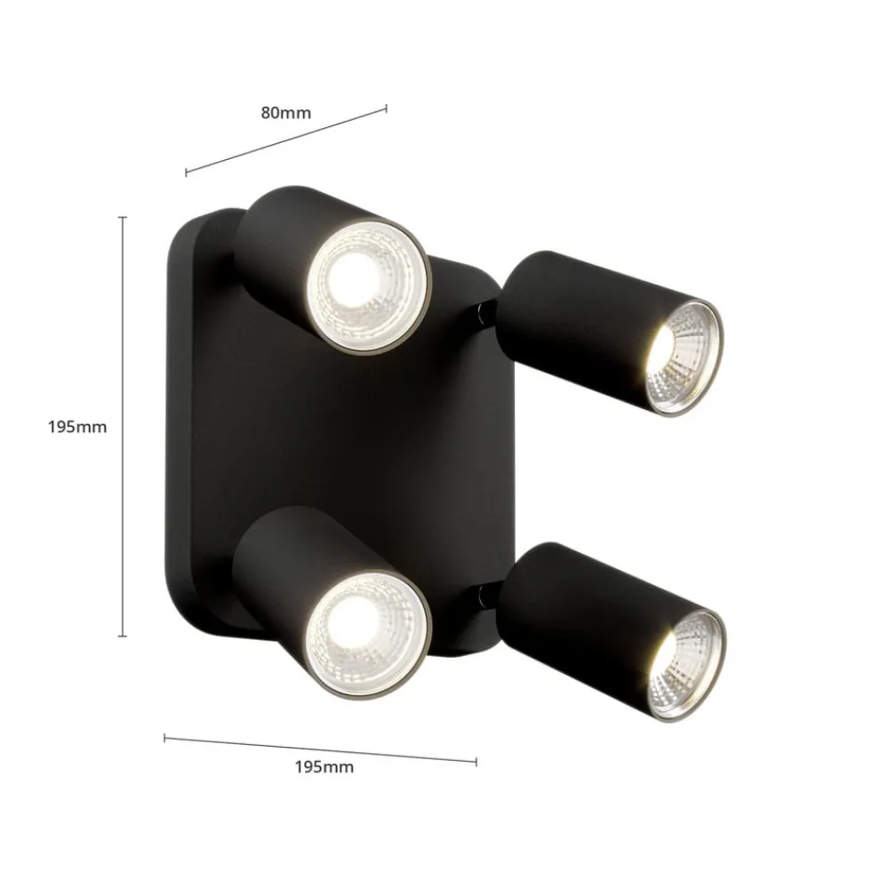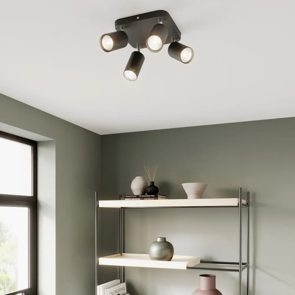 Loftlampen Eye Spot i elegant sort kombinerer moderne design med funktionel belysning. Lampen er fremstillet af højkvalitets metal og passer perfekt ind i forskellige boligområder som stuen, entreen, soveværelset og spisestuen. Konstruktionen med 4 lyskilder sikrer en jævn og effektiv belysning, der giver ethvert rum en helt særlig atmosfære.