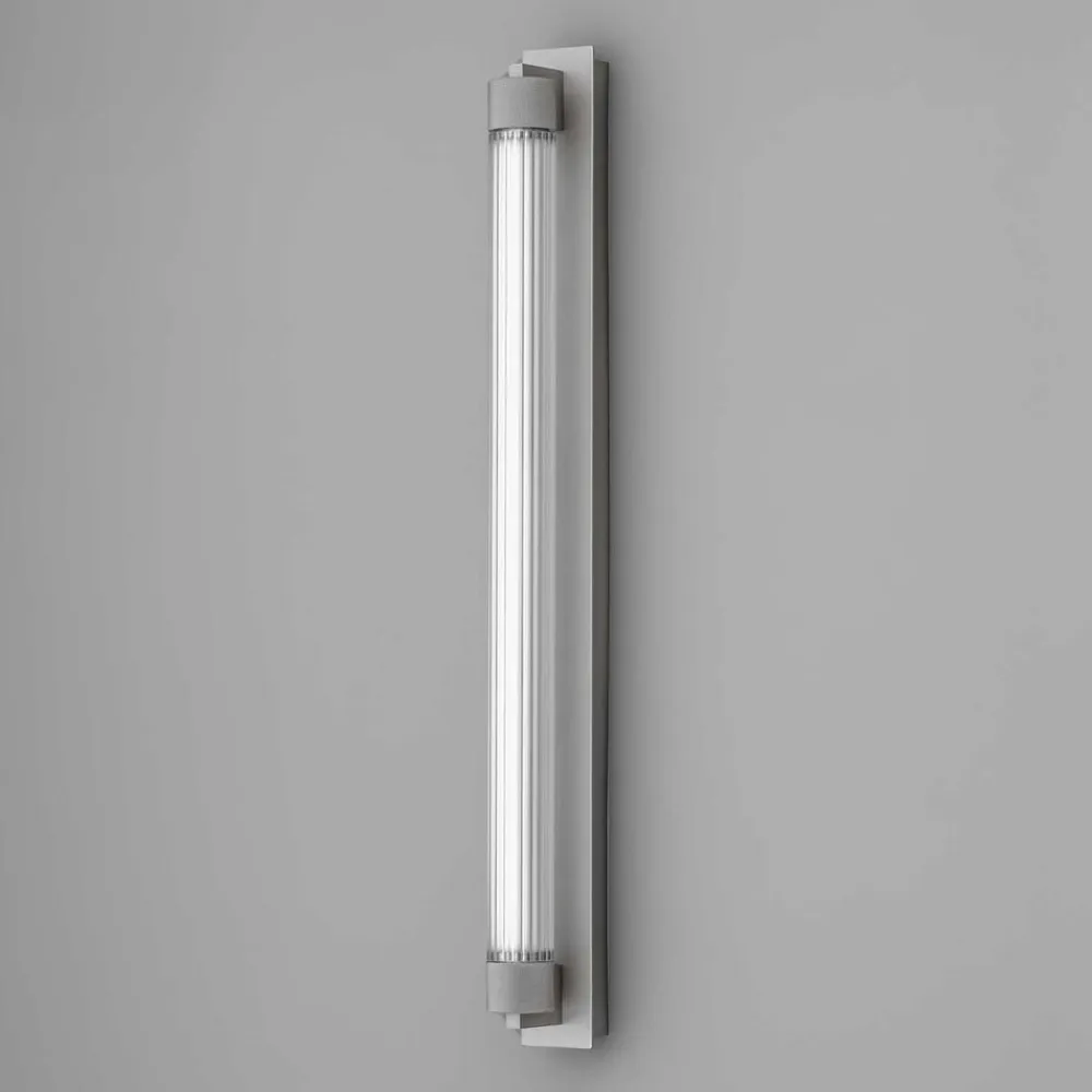 Den rektangulære vægbeslag er fremstillet af jern og aluminium og har en cylindrisk diffusor, der er omgivet af riflede hovedstykker. Borosilikatglasset har et fint, lige rillemønster.
