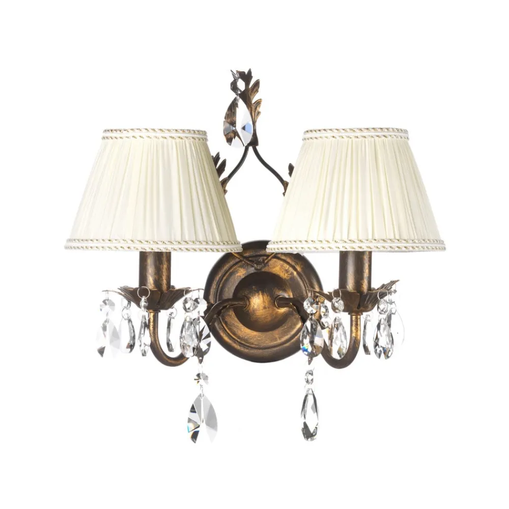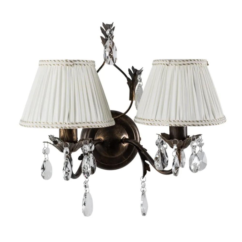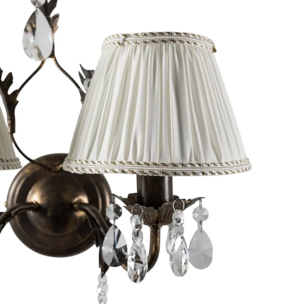 To-lys Karen væglampe i bronze med tekstilskærme Karen væglampen er designet i stil med en lysekrone med en metalramme med buede arme og krystalpendler og to samlede skærme af lyst stof. I kombination med en lysekrone og andre lamper fra serien kan den bruges til at oplyse et helt rum på en stilfuld og romantisk måde.